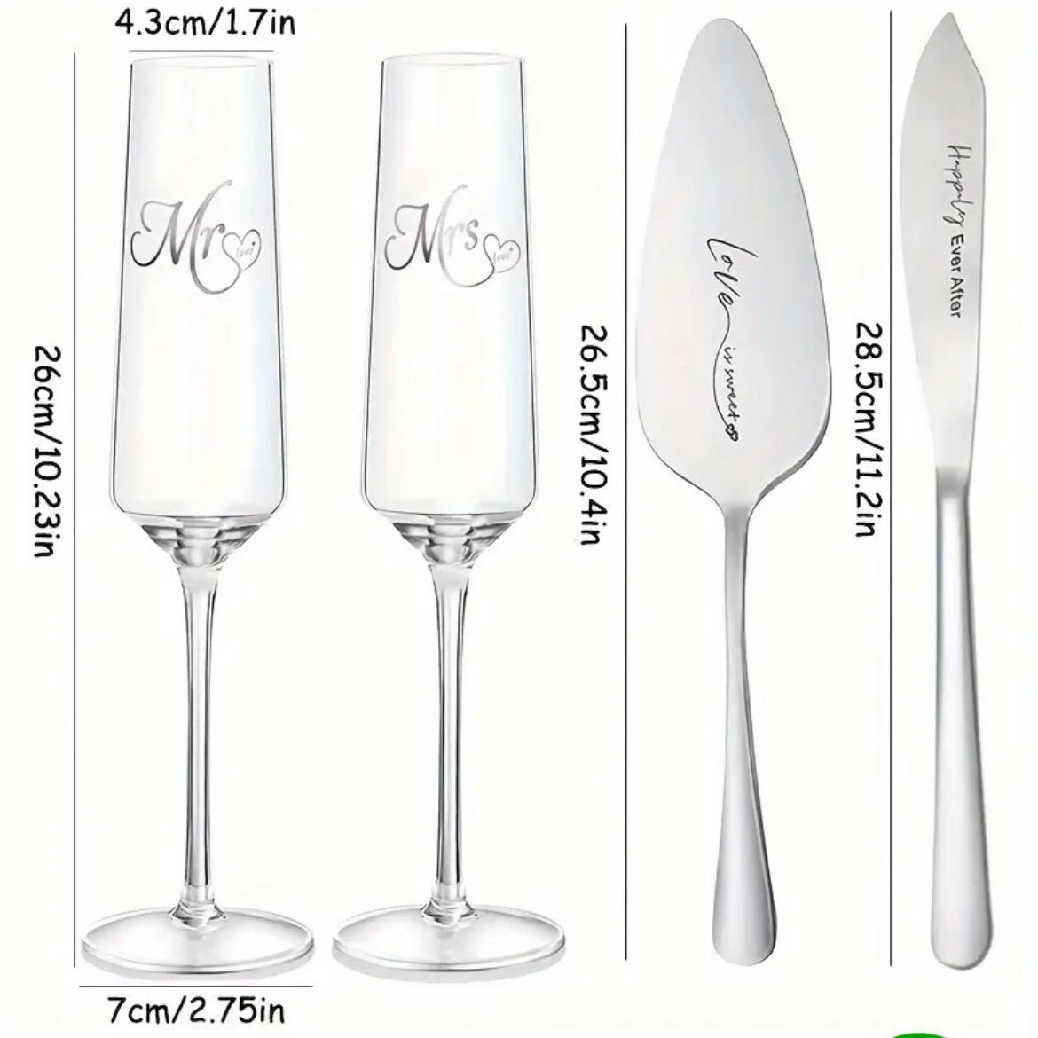 Indhold i sættet: 2 champagneglas (Mr. og Mrs.), 1 kagespade og 1 kagekniv med indgravering