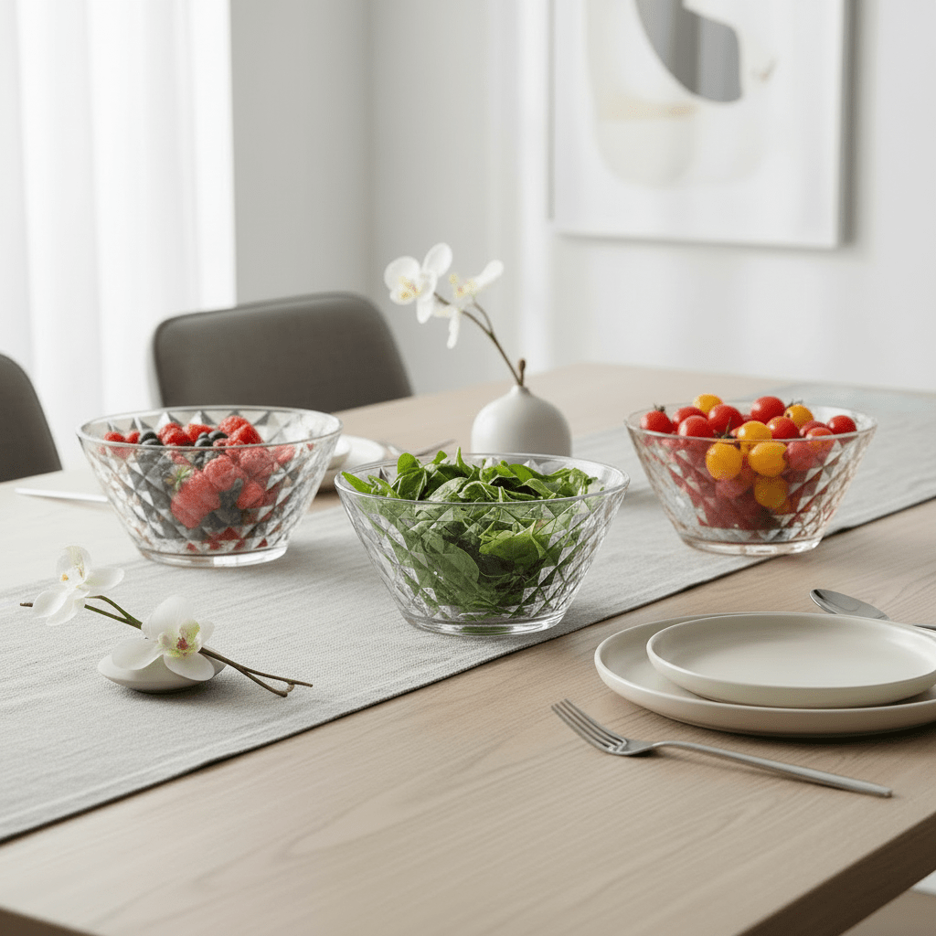 Tilføj et strejf af elegance til dit køkken med dette sæt af 3 klare Artemis glasskåle. Hver skål rummer 330 ml (11 1/4 oz) og har en smuk, mønstret overflade, der kombinerer stil og funktionalitet. Perfekt til servering af snacks, desserter, morgenmad eller småretter.