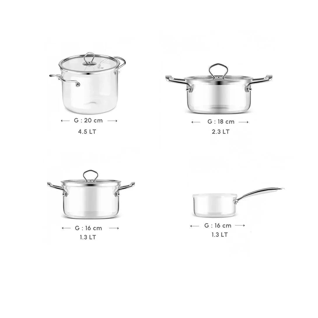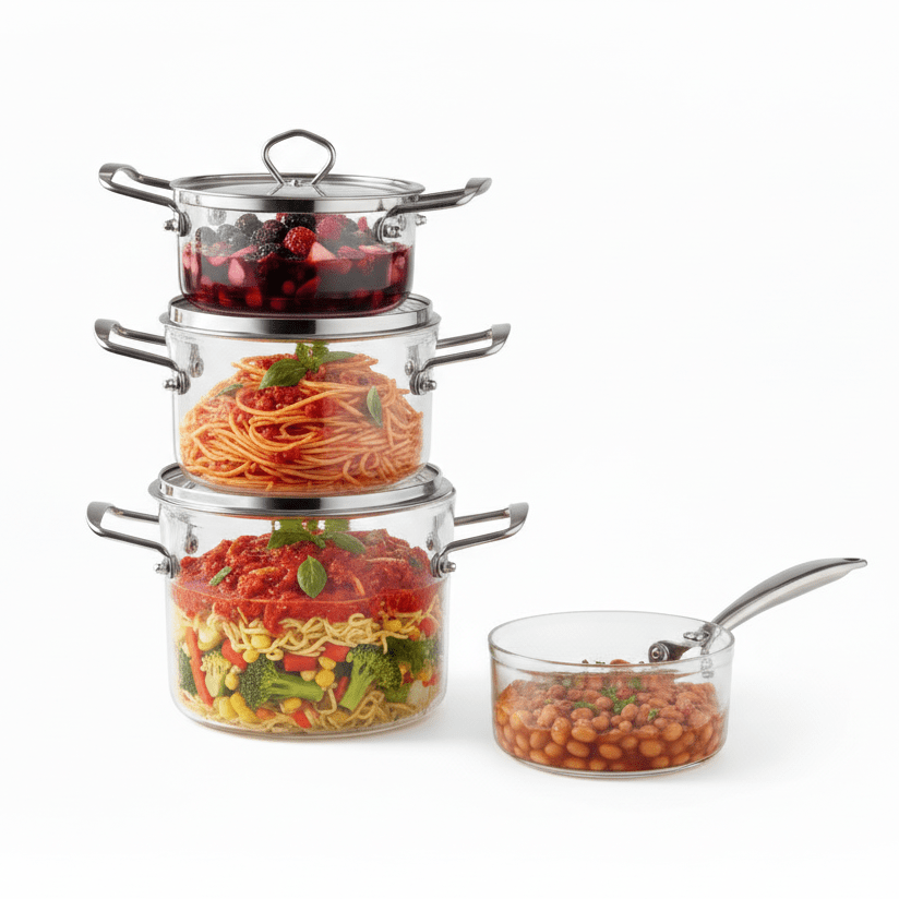 Dette eksklusive sæt er fremstillet af borosilikatglas, som er langt mere holdbart og sundere end almindeligt glas. Takket være glassets høje varmebestandighed tilberedes dine retter uden at miste næringsværdi, mens smagen bevarer sin naturlighed.