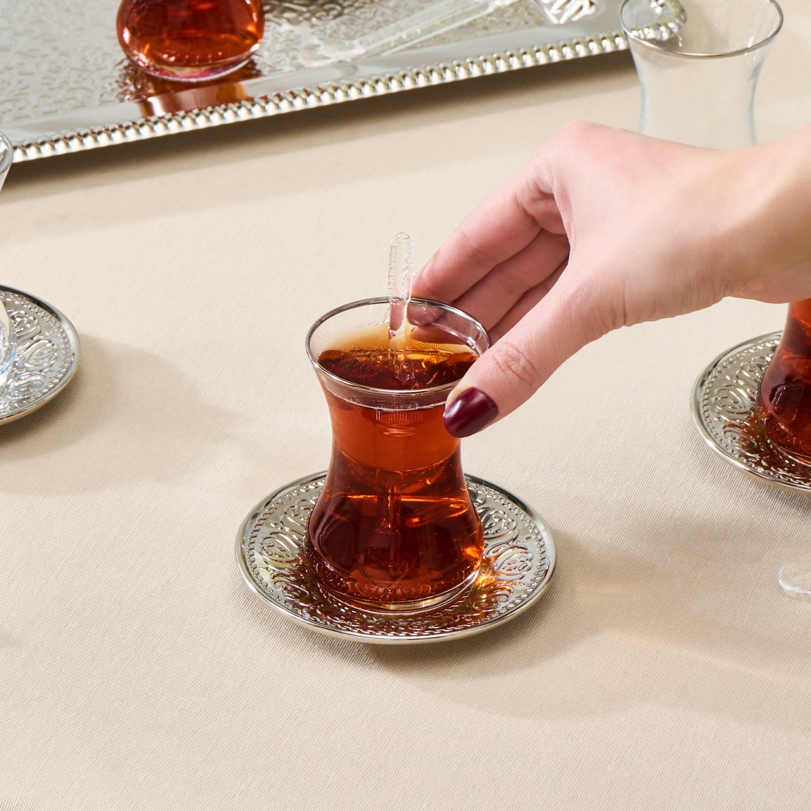 Sættet indeholder alt, hvad du behøver for en hyggelig tepause – fra smukke glas til elegante underkopper og serveringsdele. Fremstillet af kvalitetsglas og porcelæn, som sikrer holdbarhed og et stilrent udtryk.