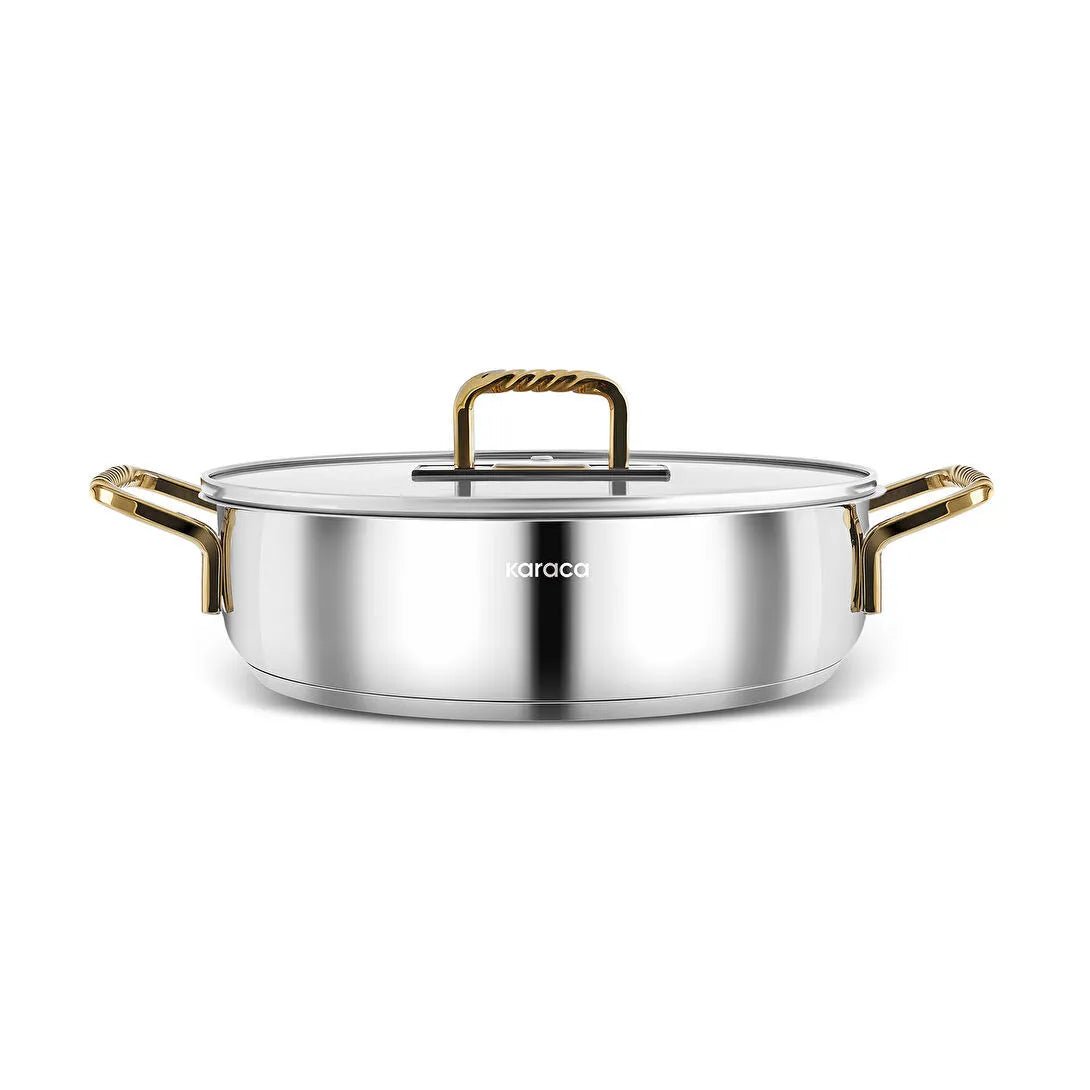 Tilbered klassiske og moderne retter med stil ved hjælp af Karaca Maçka stål gryden. Denne elegante gryde i guld-look er fremstillet af 18/10 rustfrit stål i høj kvalitet, som sikrer både holdbarhed, effektiv varmefordeling og et eksklusivt udtryk i køkkenet.