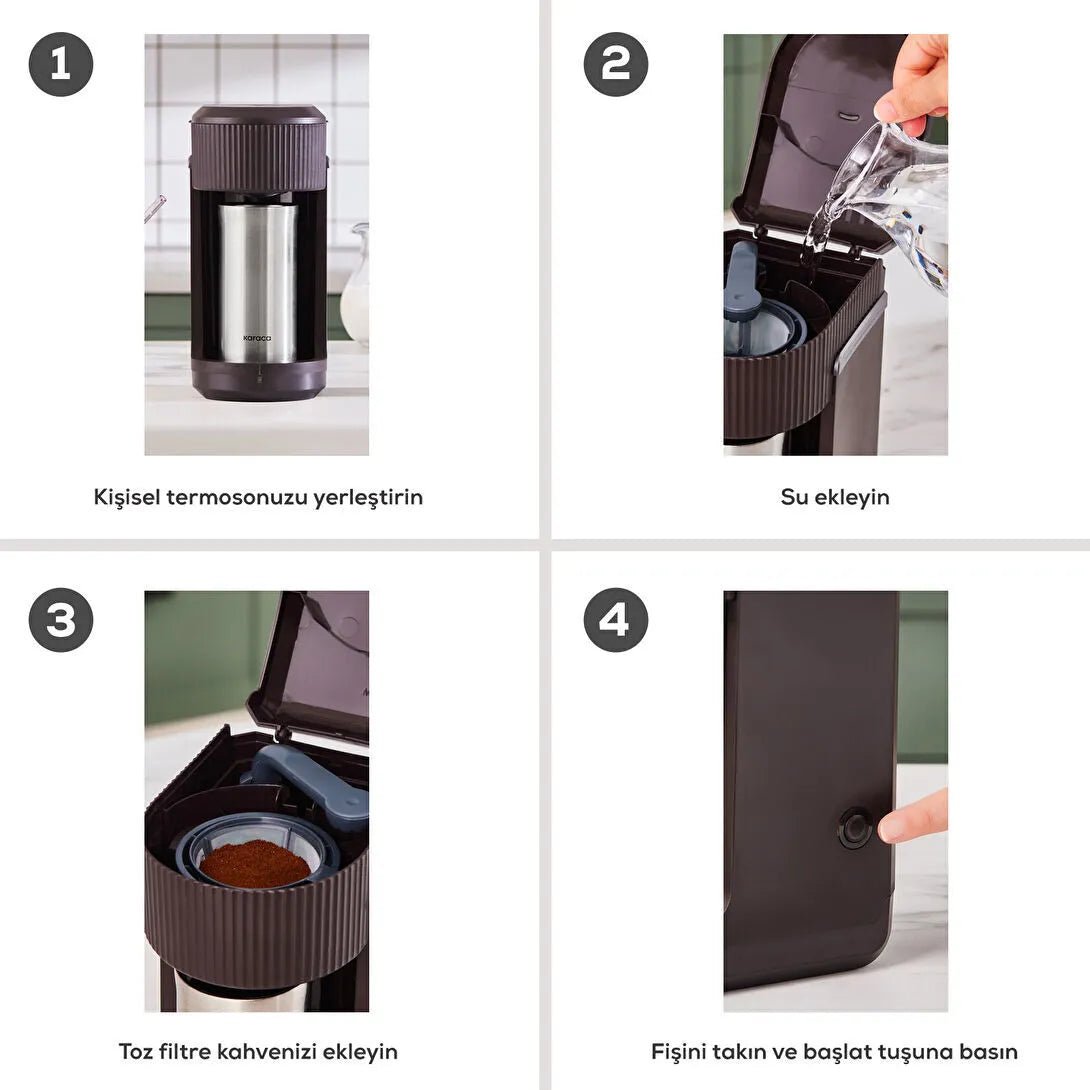 Karaca Mono personlig filterkaffemaskine er den ideelle løsning til dig, der ønsker friskbrygget kaffe i hverdagen – hurtigt, nemt og fleksibelt. Maskinen leveres med en gratis personlig termokande og har et elegant design i valnøddebrun, som passer perfekt ind i det moderne køkken.