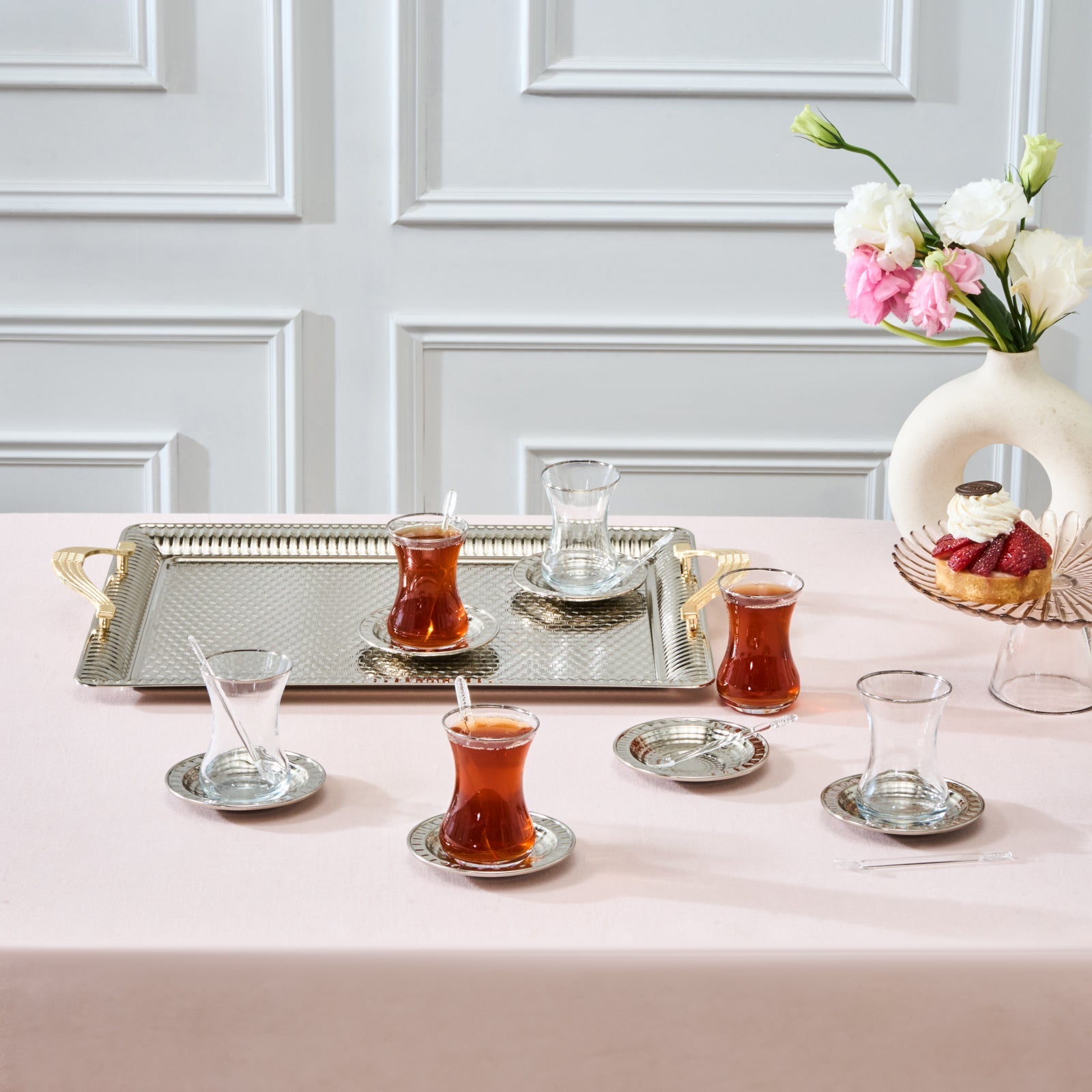 Sættet indeholder alt, hvad du behøver for en hyggelig tepause – fra smukke glas til elegante underkopper og serveringsdele. Fremstillet af kvalitetsglas og porcelæn, som sikrer holdbarhed og et stilrent udtryk.