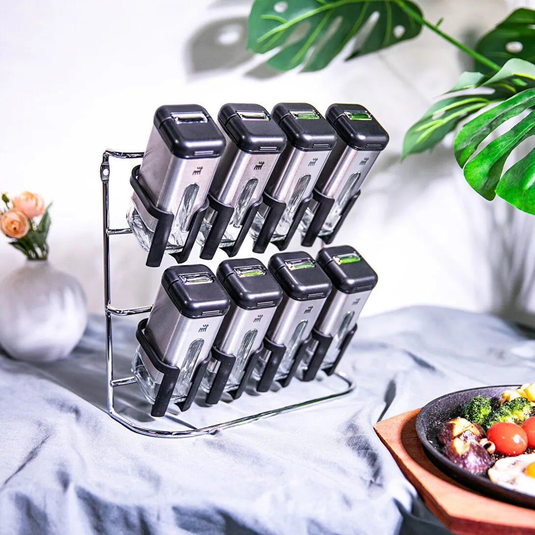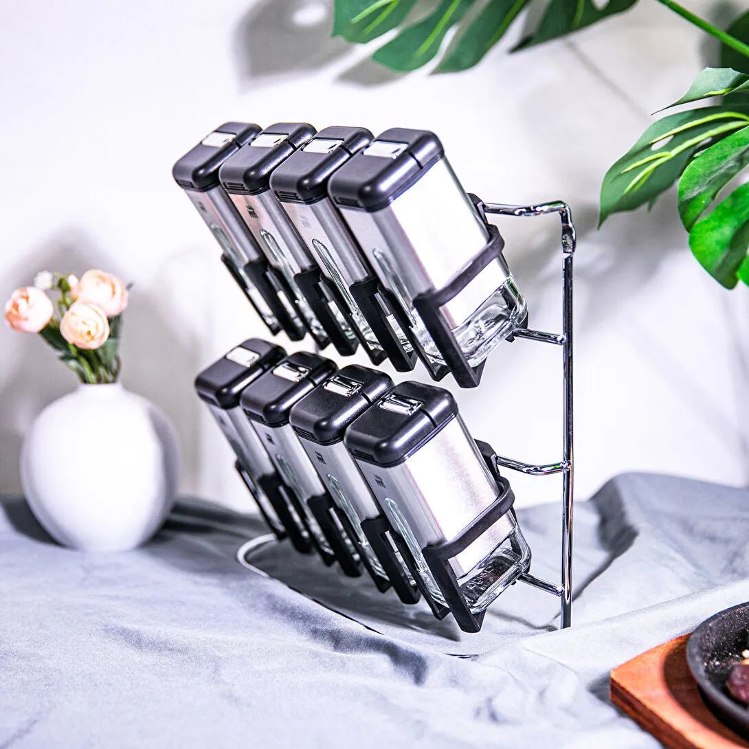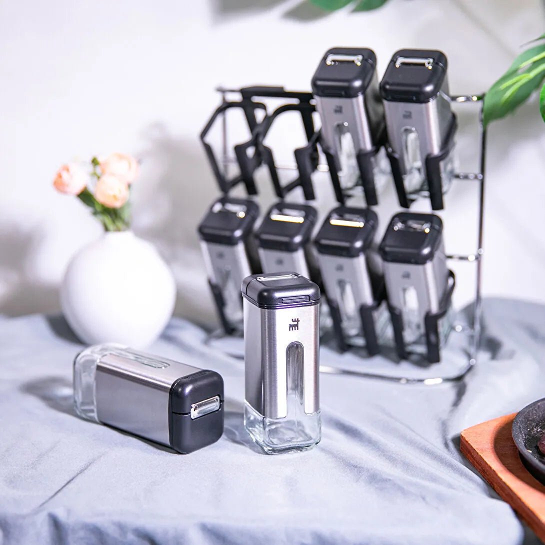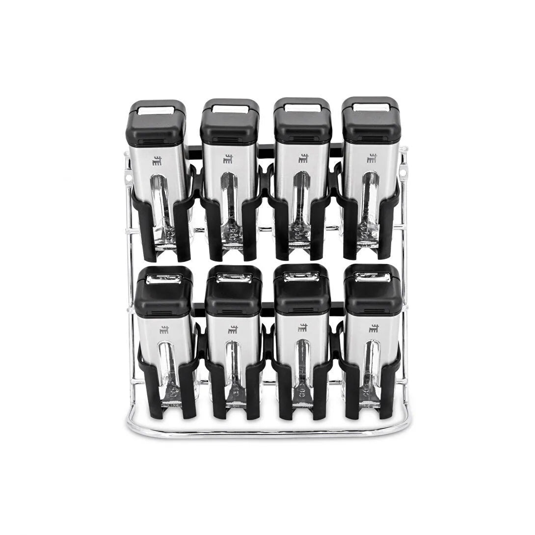 Pladsbesparende holder: Sættet leveres med en elegant holder, der holder styr på krukkerne og sikrer, at de altid står pænt samlet.