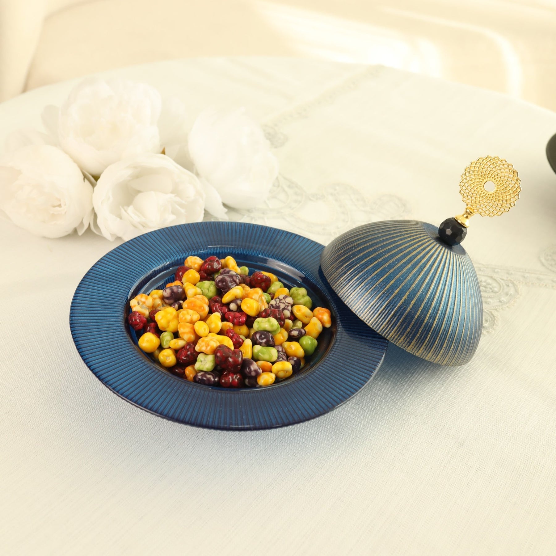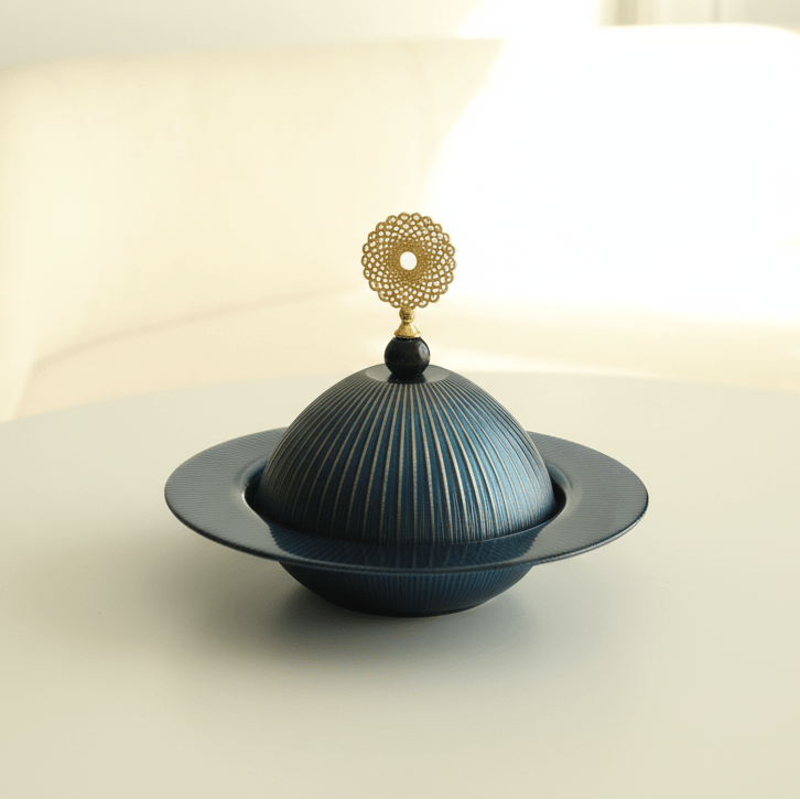 Denne farverige skål til tyrkisk delight bringer en eksklusiv og orientalsk stemning til borddækningen. De elegante gyldne dekorationer kombineret med den dybe navy blå farve skaber et luksuriøst udtryk, der fuldender præsentationen af traditionelle delikatesser.