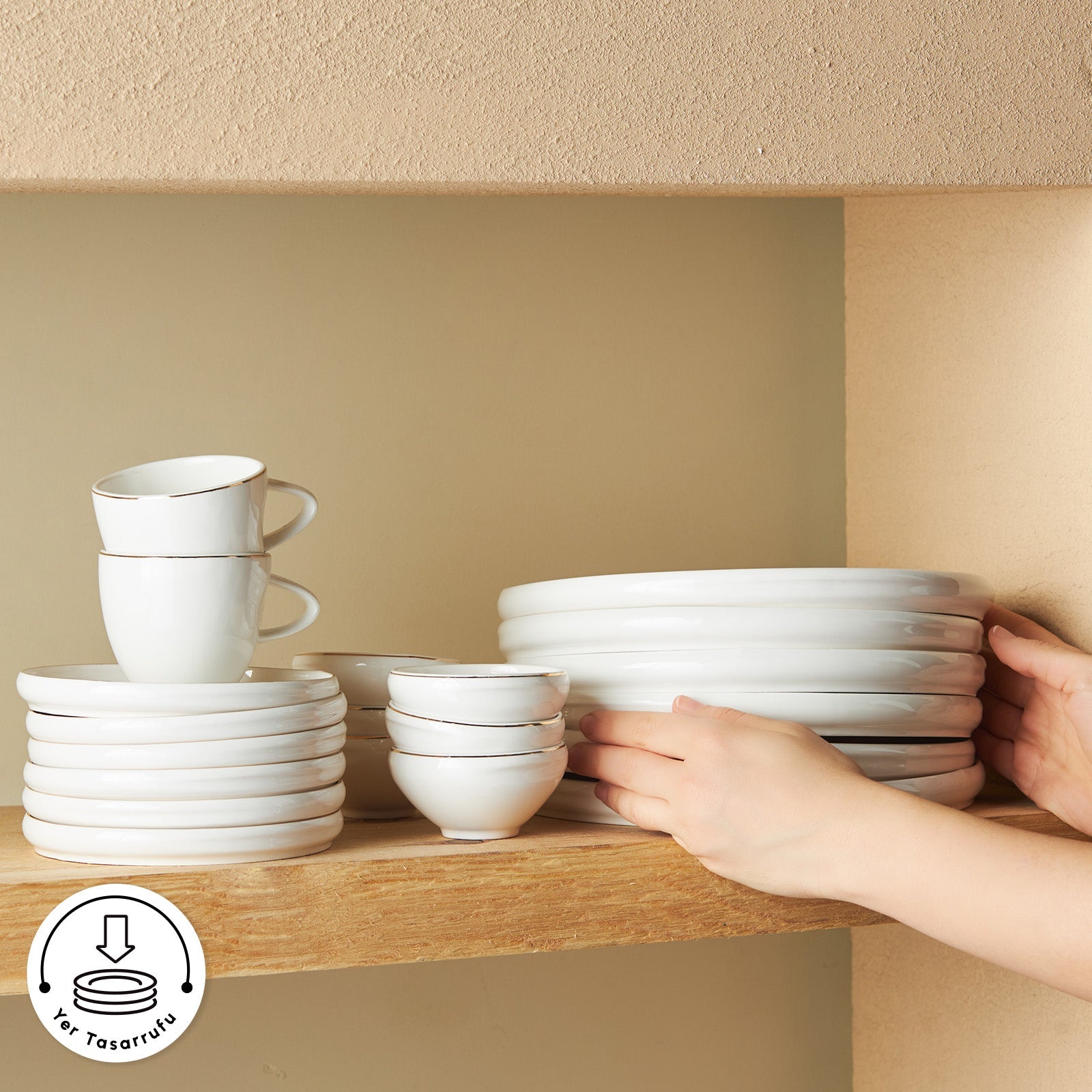 Gør din morgenmad mere elegant med Karaca Stream Bone Sunset. Dette smukke sæt til 6 personer består af 34 dele i et stilfuldt design med gyldne detaljer.