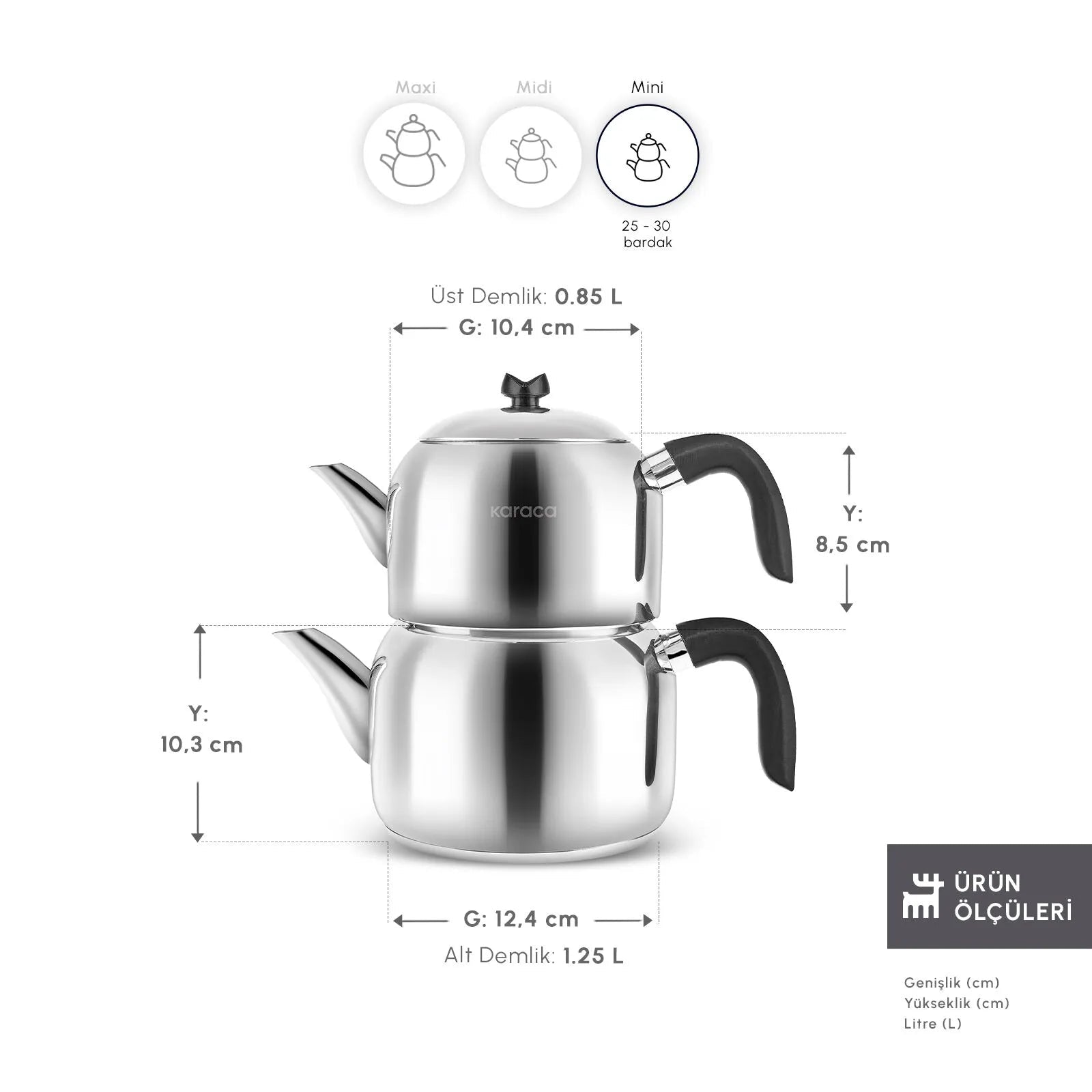 Karaca Laris mini tekandesæt er et praktisk og stilrent sæt, der gør det nemt at brygge og servere traditionel te. Den kompakte størrelse gør sættet ideelt til mindre husholdninger eller når du laver te til få personer.