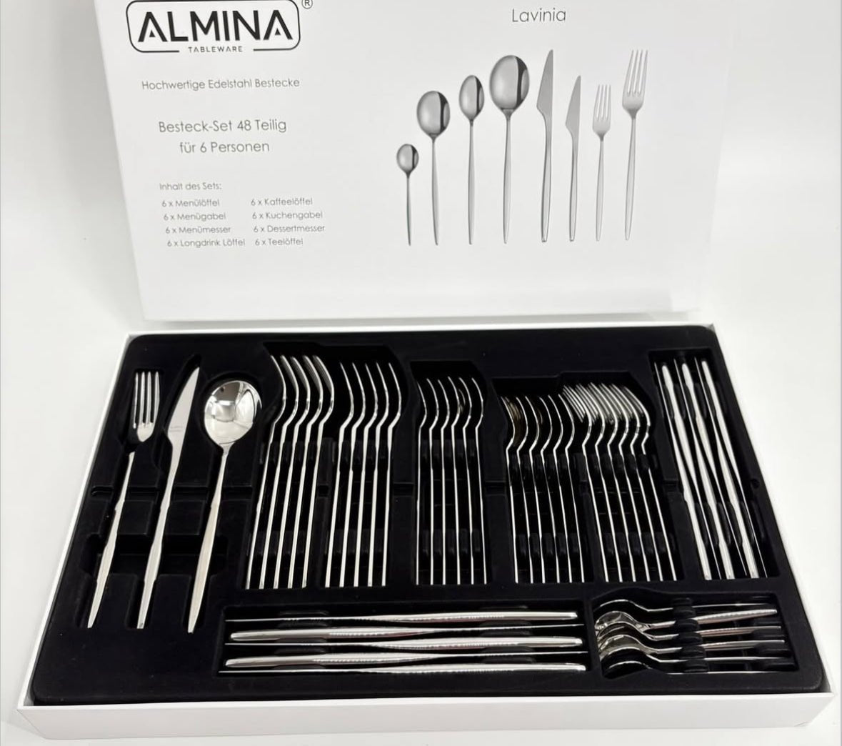 Skab en elegant og harmonisk borddækning med Almina Lavinia bestiksæt i 48 dele. Bestikket er fremstillet i eksklusivt 18/10 rustfrit stål, som sikrer høj slidstyrke, flot finish og lang levetid. Det tidløse og stilrene design gør sættet ideelt til både hverdagsmåltider og festlige middage.