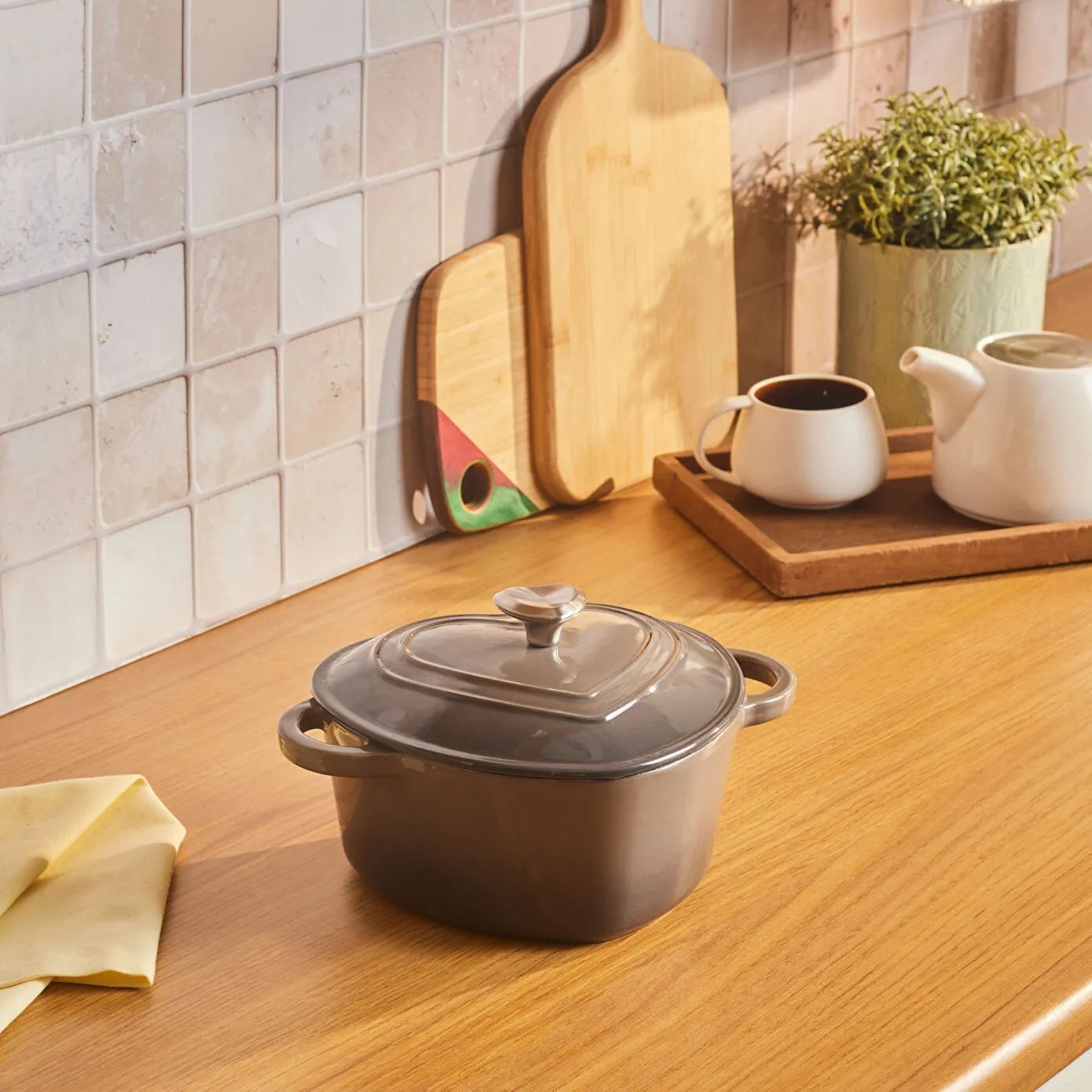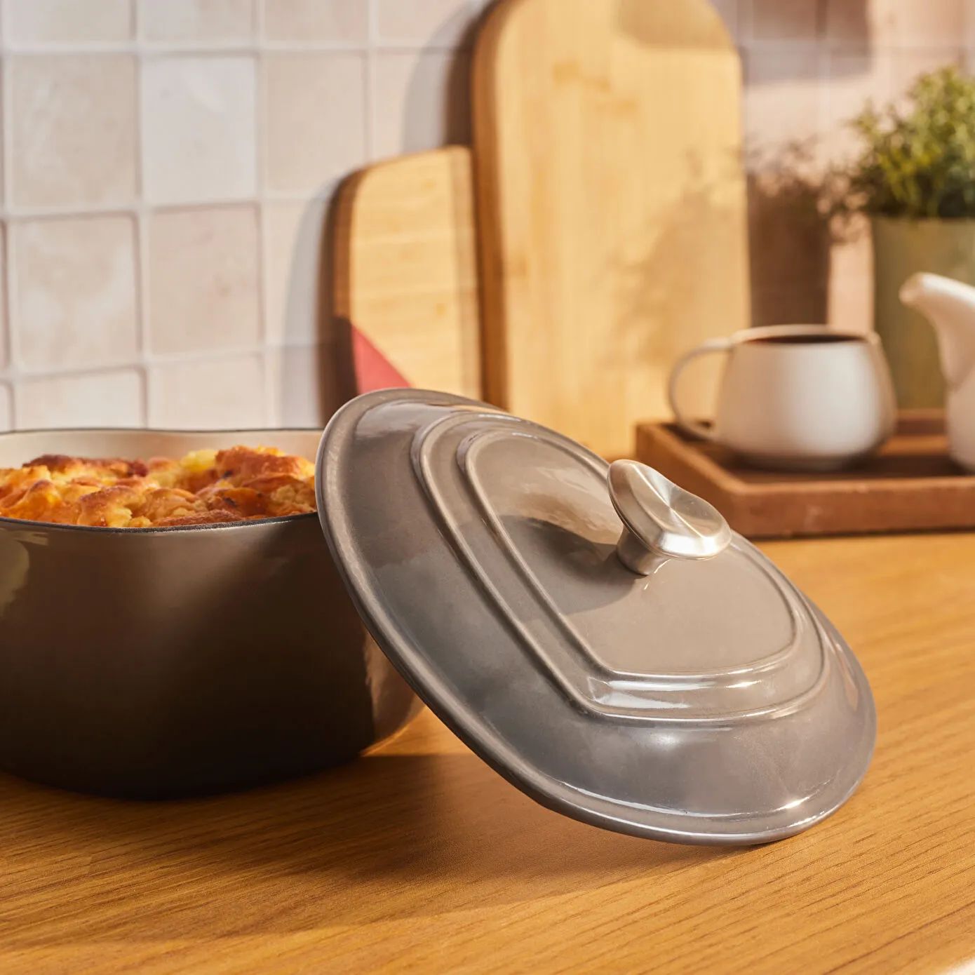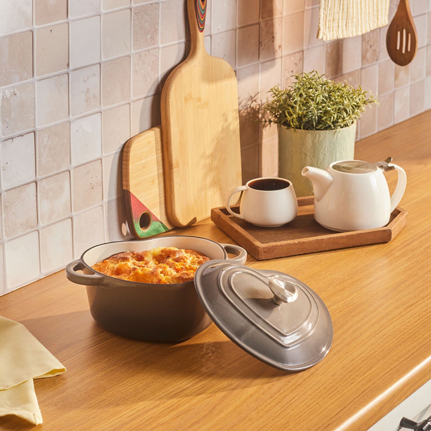 Den kompakte størrelse gør gryden ideel til mindre retter, servering direkte fra gryden eller til ovnretter. Det elegante farvespil med grå yderside og cremefarvet inderside giver et stilfuldt udtryk, der passer perfekt til både køkken og spisebord.