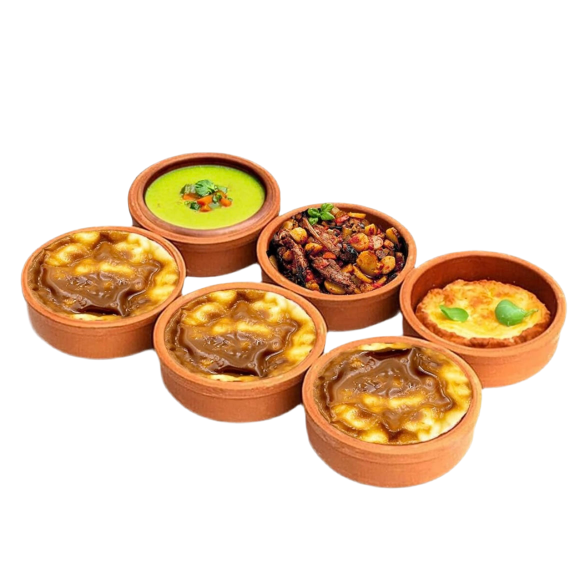 Disse skåle er særligt ideelle til klassiske tyrkiske desserter som Sütlaç (risengrød bagt i ovn), hvor lerets varmefordelende egenskaber sikrer en jævn bagning og en lækker, karamelliseret overflade. Samtidig er de også velegnede til servering af små retter, meze, tapas eller varme snacks.