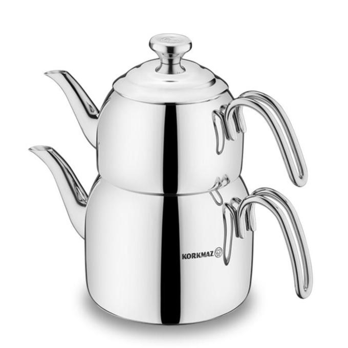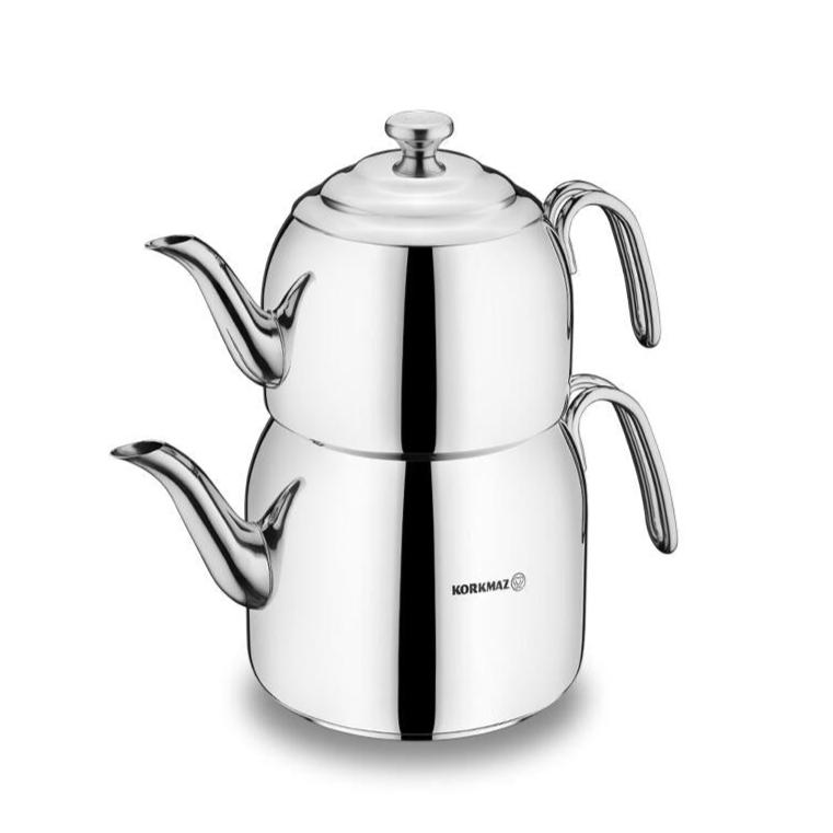Elegant Droppa dobbelt tekandesæt i rustfrit stål. Ideel til brygning af tyrkisk te. Sættet består af en under- og en overkande med låg.