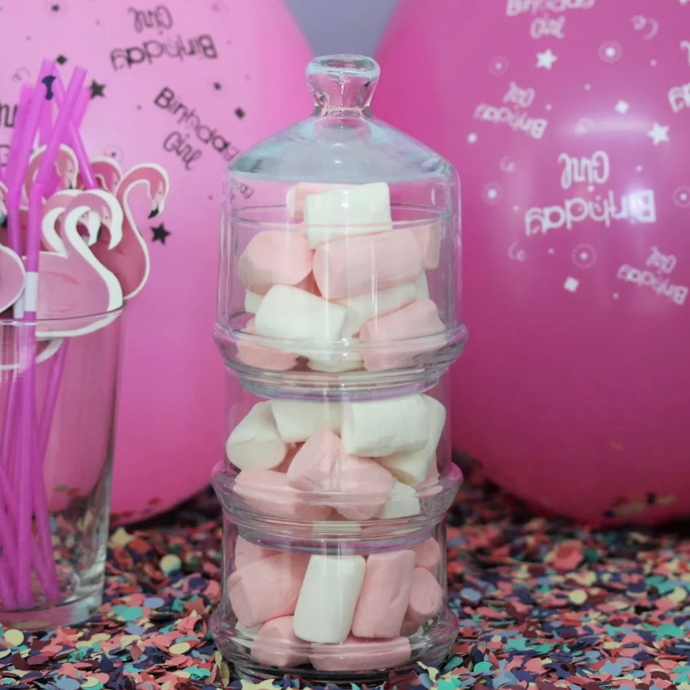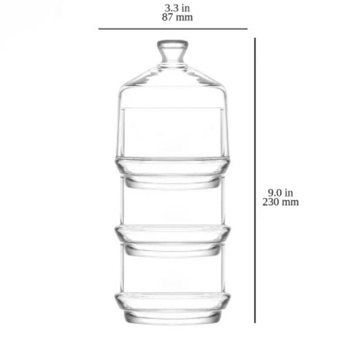 3 glasskåle kan placeres ovenpå hinanden med låg og skilles ad.