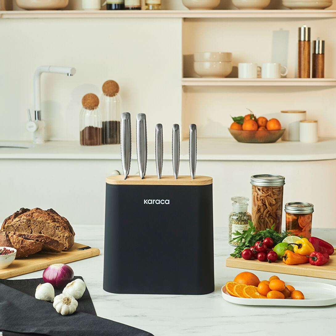 Stilren sort knivblok med trælook