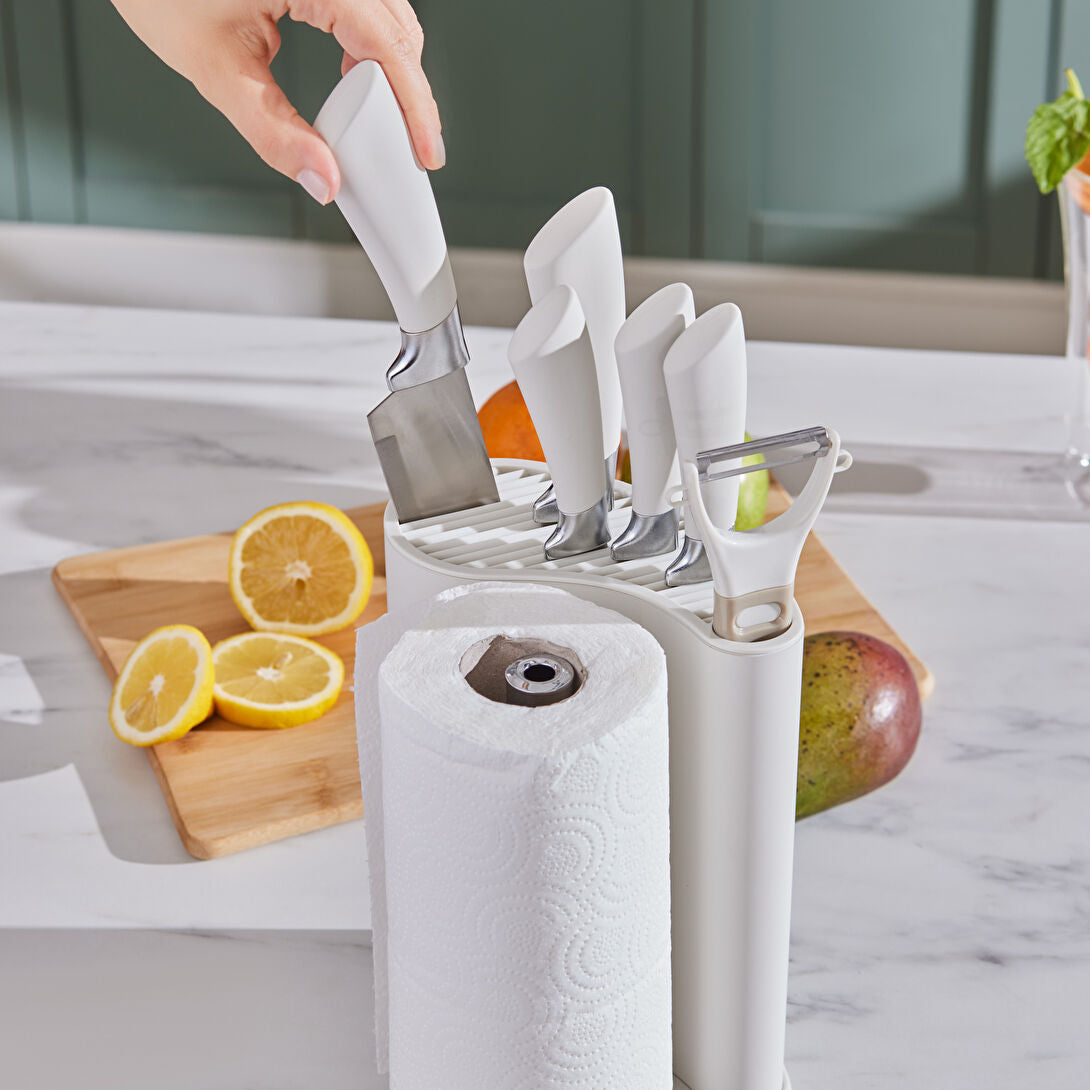 Gør køkkenarbejdet nemmere og mere effektivt med Karaca Mega Force 7-delt knivsæt, et alsidigt sæt designet til daglig madlavning. Sættet kombinerer skarpe knive i slidstærk 420 stålkvalitet med en praktisk servietholder, der sikrer både orden og funktionalitet på køkkenbordet.