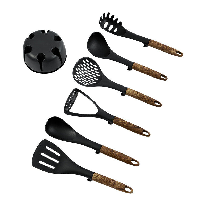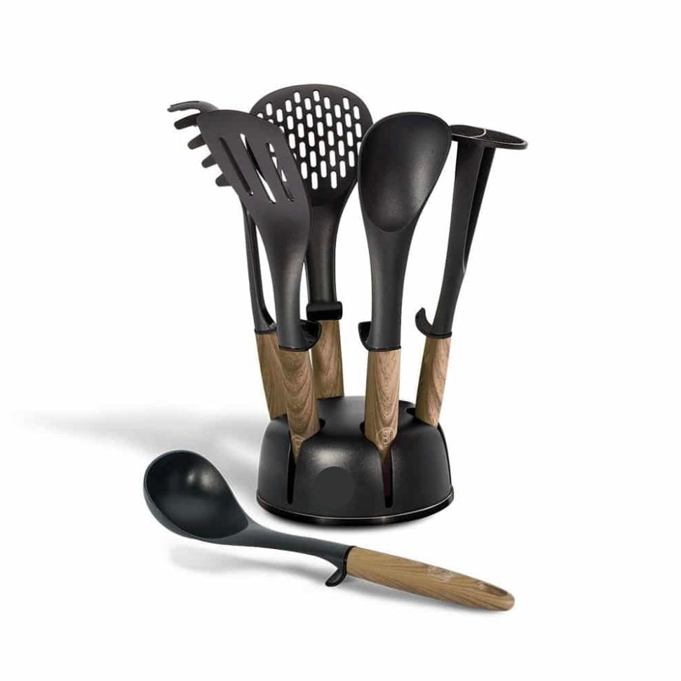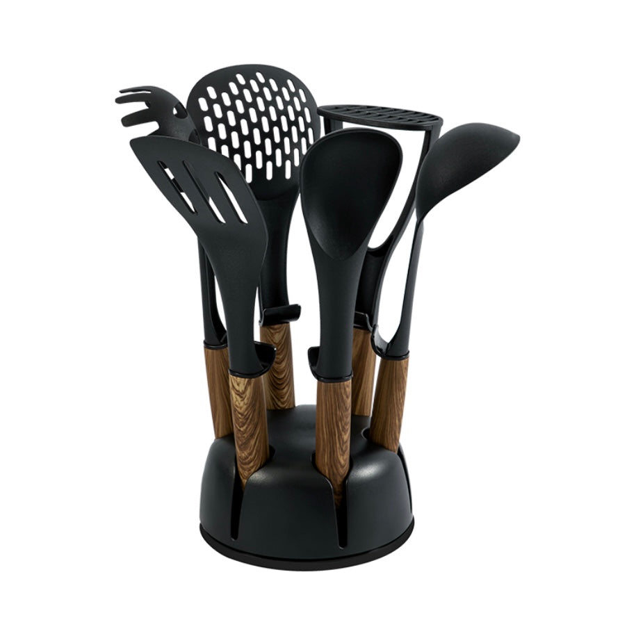 Dette komplette hjælper-sæt fra Schäfer leveres med syv essentielle redskaber i højkvalitets nylon, med varmebestandige ender og ergonomiske håndtag med træ-look. Grebet er designet, så redskaberne kan hænges på kanten af gryder uden at røre bordfladen — en praktisk detalje, der mindsker rod og holder dit arbejdsområde rent.