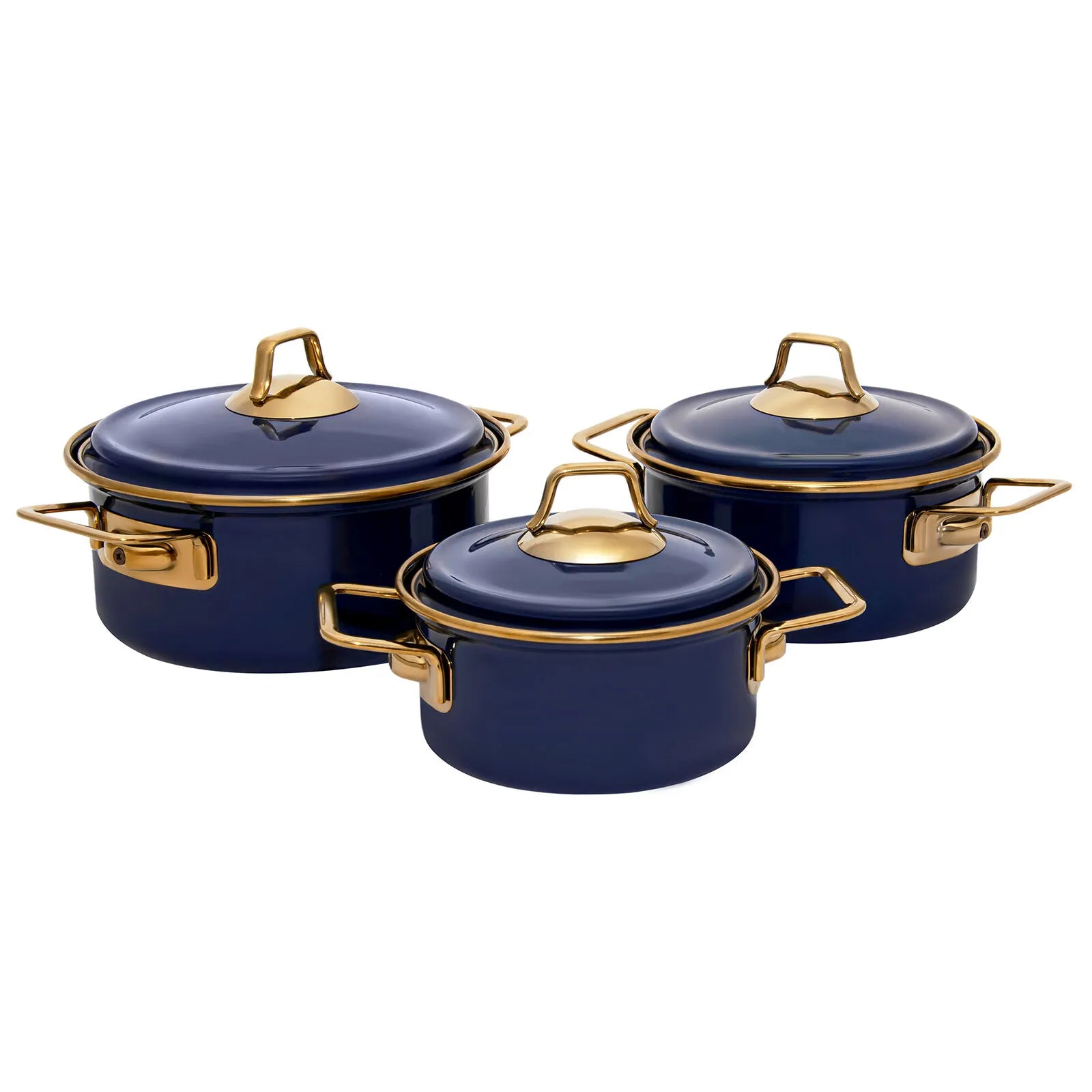 Sættet består af tre gryder i forskellige størrelser med tilhørende låg, hvilket gør det velegnet til alt fra små portioner til daglig madlavning. Det tidløse design kombineret med den dybe mørkeblå farve giver køkkenet et stilfuldt og dekorativt præg.