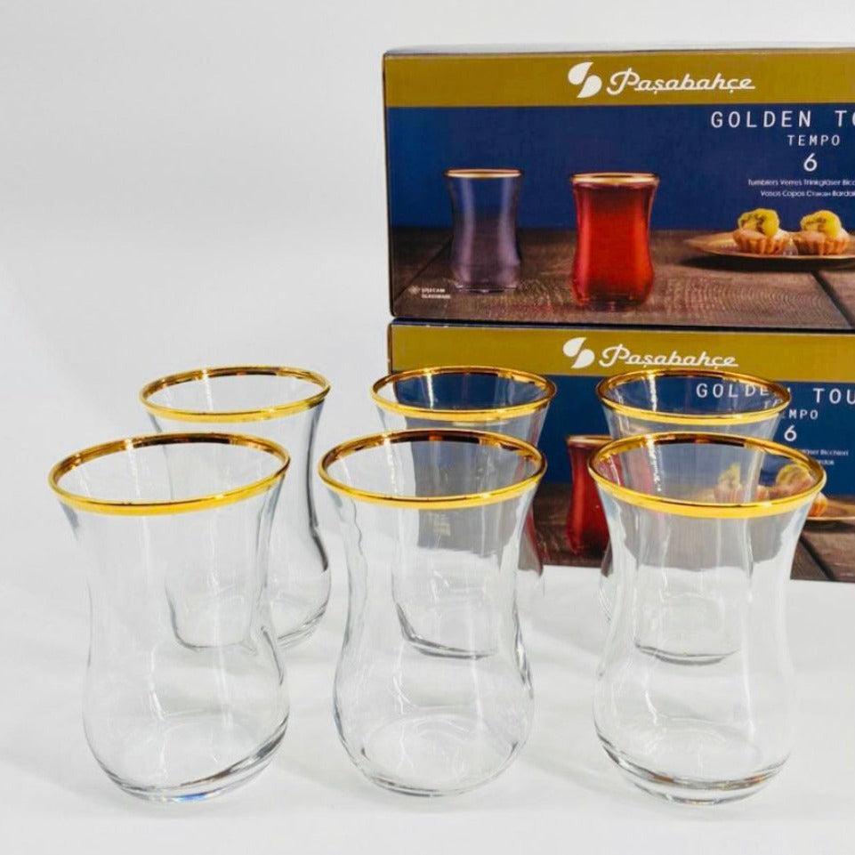 Dette luksuriøse sæt indeholder 6 elegante teglas med en gylden kant, der tilføjer en fornem og sofistikeret touch til dine te-stunder. Perfekt til at nyde te i stil og elegance.