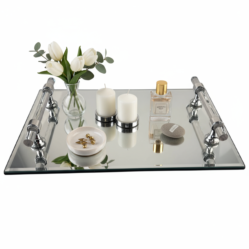 Serveringsbakke i sølv med spejlbund – 30 x 20 cm