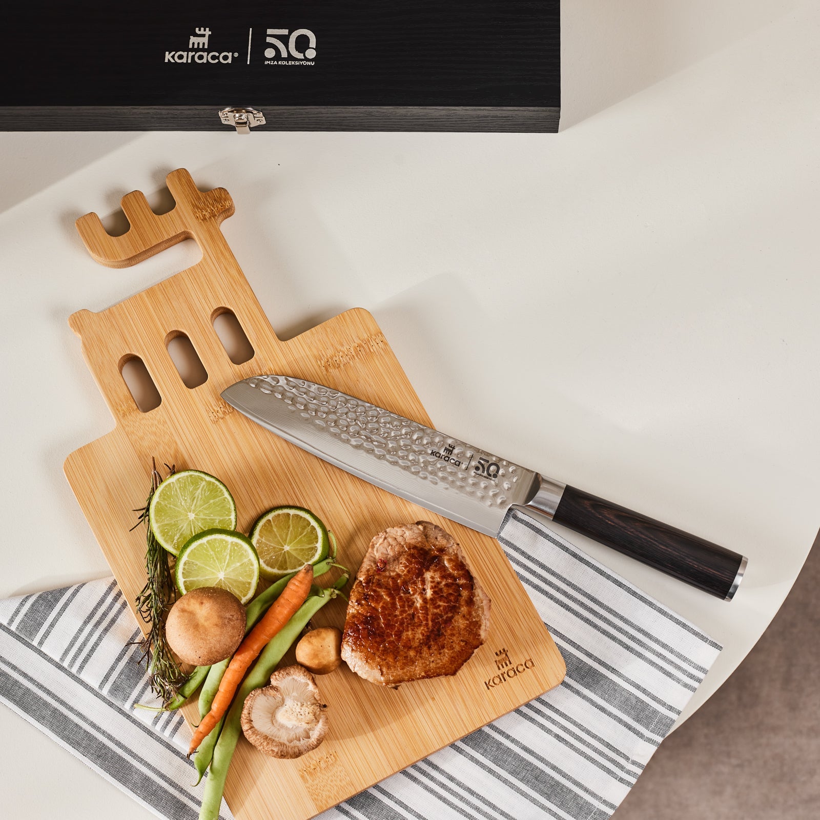 I anledning af Karacas 50-års jubilæum præsenteres denne eksklusive signaturkniv, skabt som en hyldest til halvtreds år med kvalitet og innovation. Kniven er fremstillet af førsteklasses rustfrit stål med en karakteristisk hamret klinge, der ikke blot tilføjer et unikt visuelt udtryk, men også reducerer friktionen, så råvarerne slipper lettere under skæring.