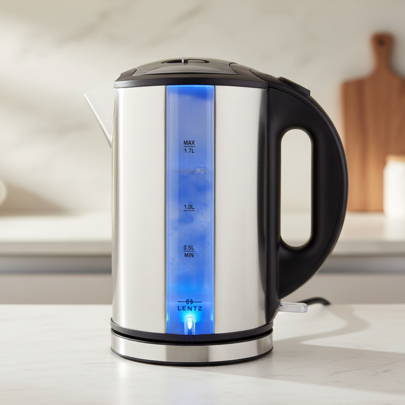 Denne elkedel fra Lentz har en kapacitet på 1,7 liter og er udstyret med LED-belysning, aftagelig filter og både automatisk og manuel slukning. Den har sikkerhedsfunktioner mod overophedning og tørkogning samt en sikkerhedslåg. Elkedlen er velegnet til både venstre- og højrehåndede brugere og fungerer trådløst for nem betjening.