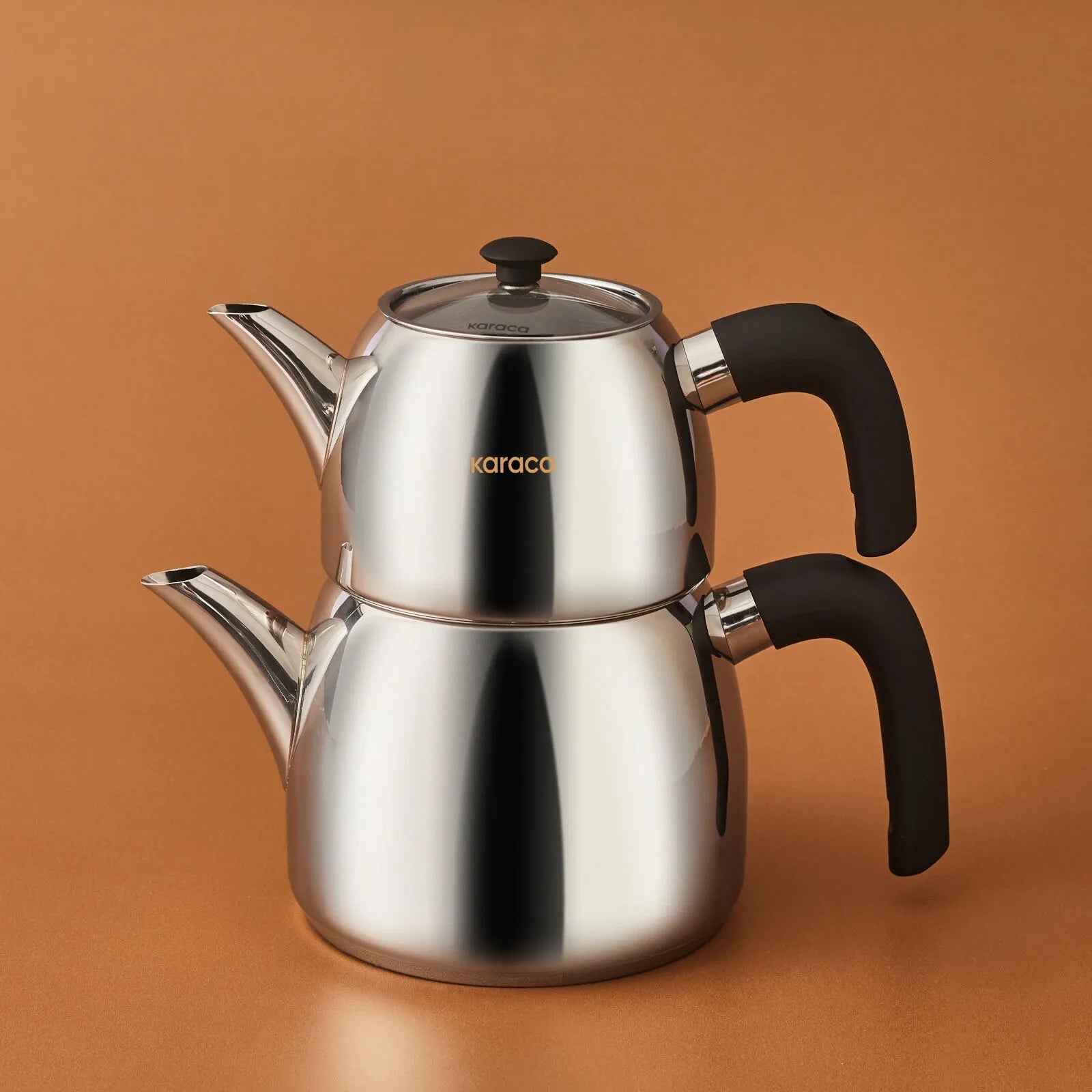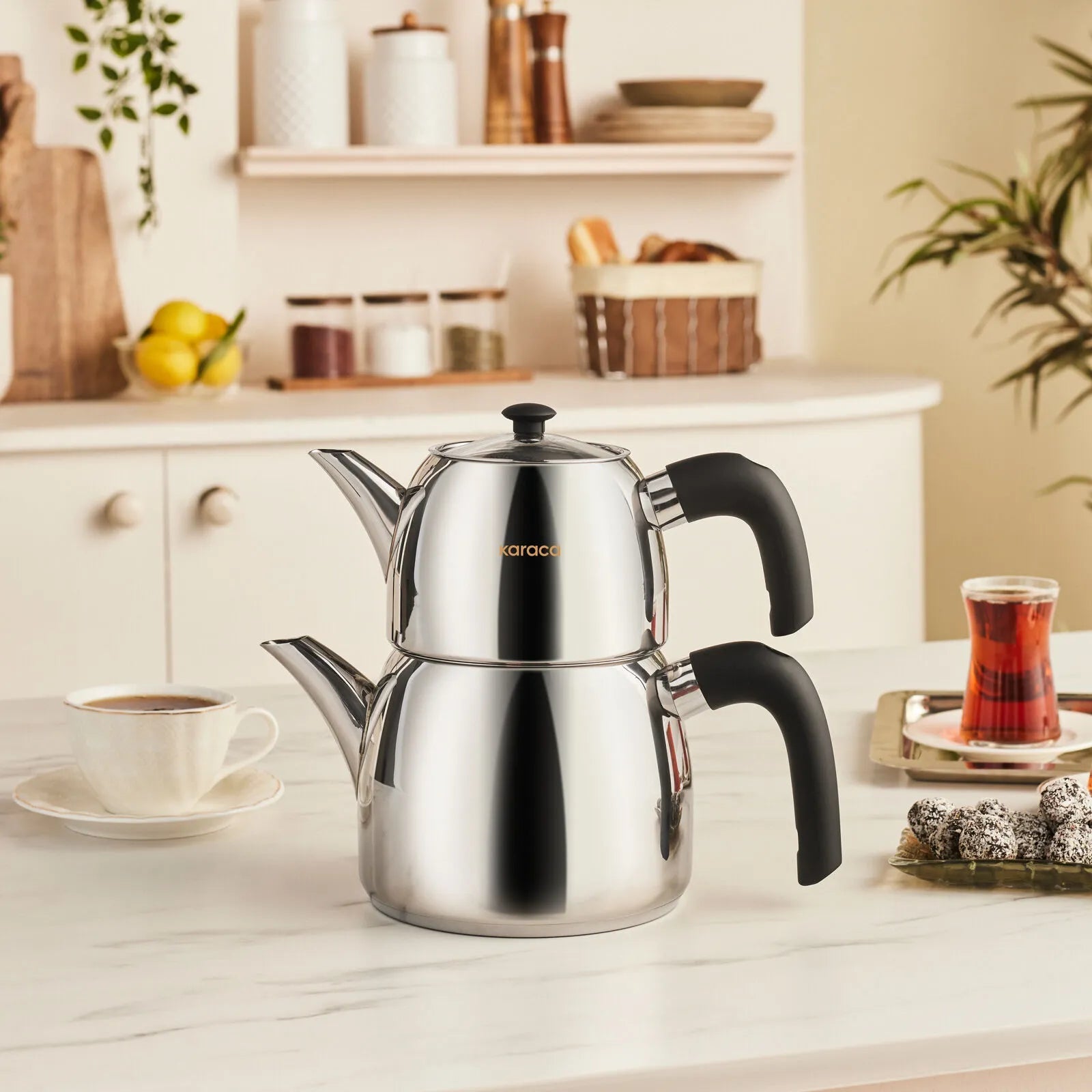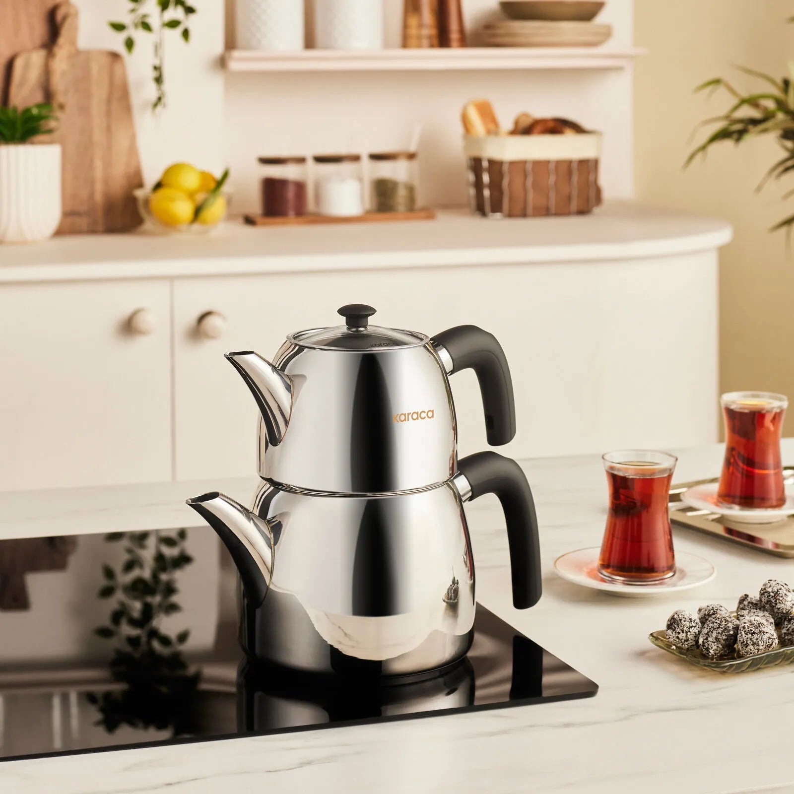 Nyd perfekt brygget te med Karaca New Galya Midi Tekandesæt, der kombinerer stilrent design med høj funktionalitet. Sættet er fremstillet i slidstærkt rustfrit stål, som sikrer lang holdbarhed og et elegant udtryk i køkkenet.