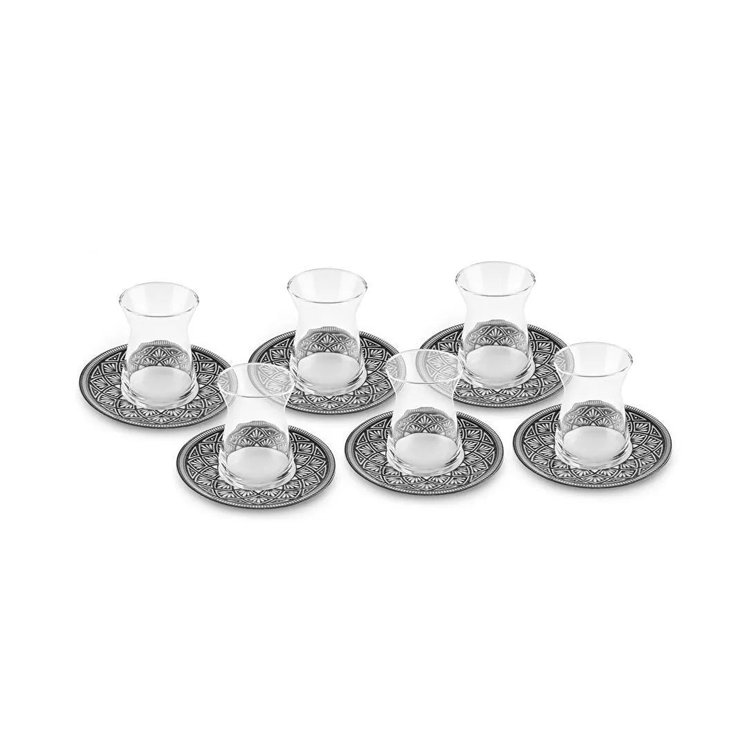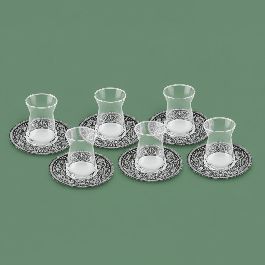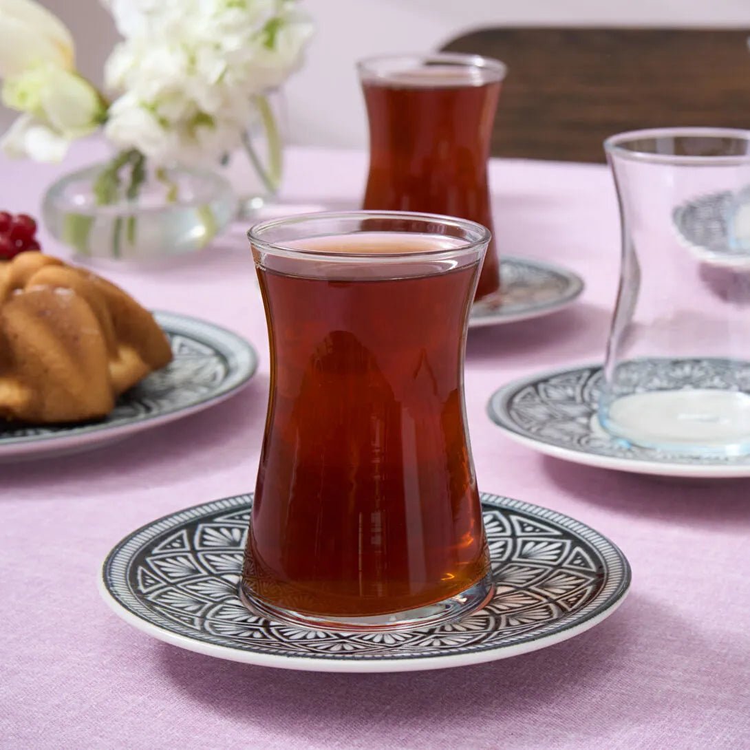 Stilfuldt og moderne teglassæt fra Karaca Lenny, perfekt til servering af te til familie og gæster. Kombinationen af transparente glas og mønstrede underkopper i sort og hvid giver et elegant og tidløst udtryk.