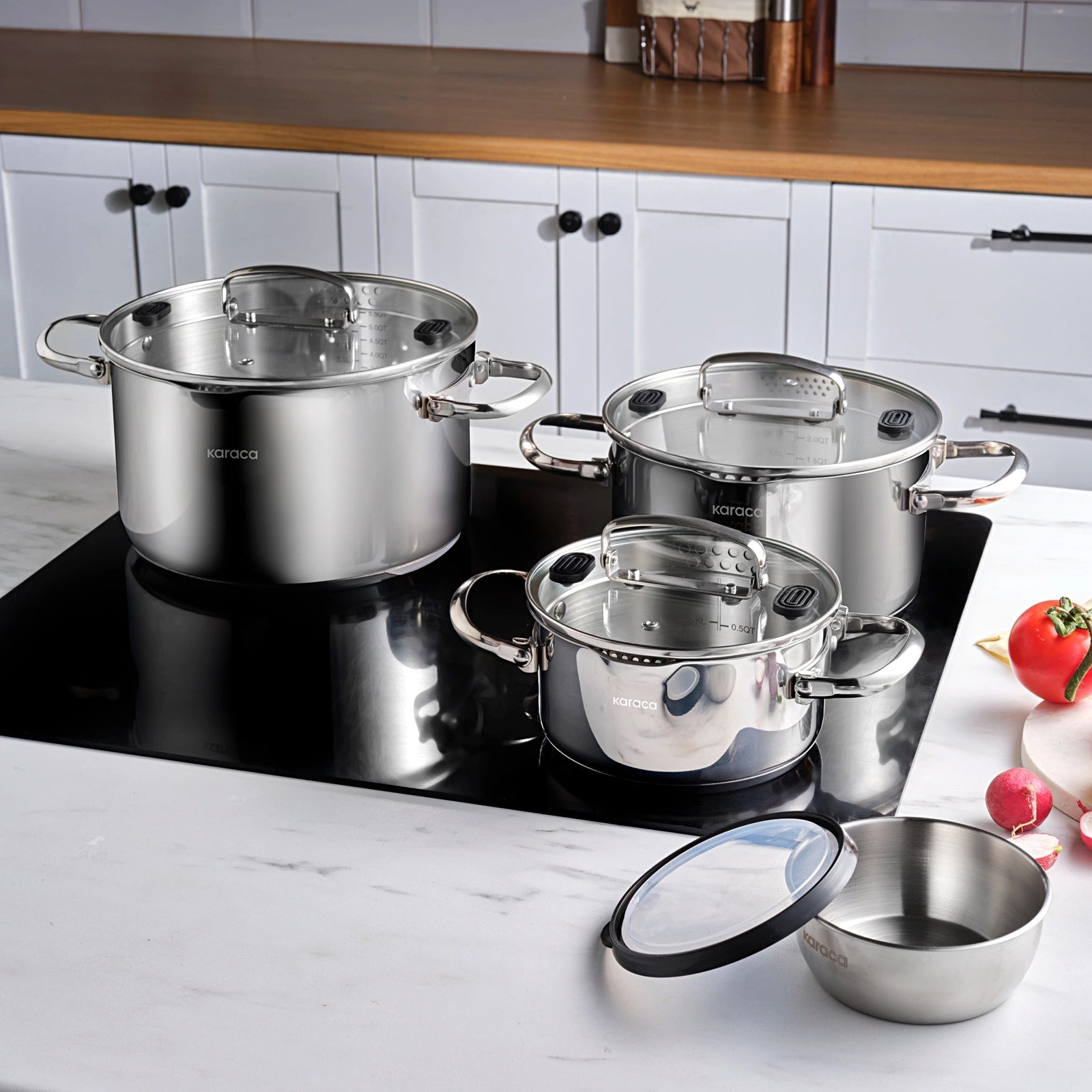 Et funktionelt og moderne grydesæt fra Karaca, perfekt til dig der ønsker kvalitet, fleksibilitet og smart opbevaring i køkkenet.