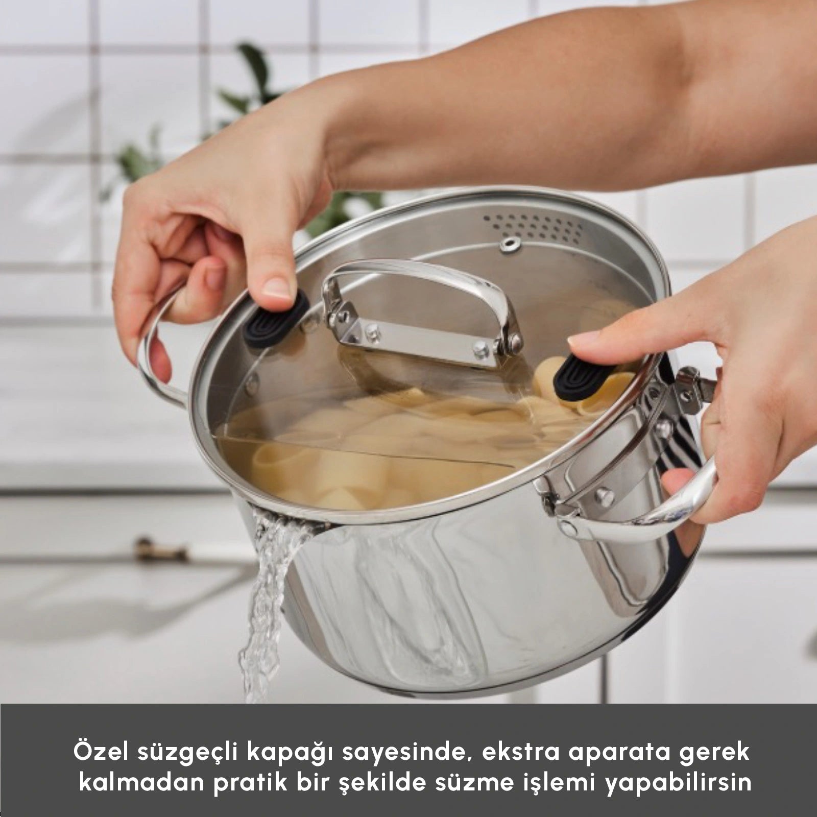 De innovative, foldbare håndtag og den indstabelbare konstruktion gør det muligt at opbevare gryderne kompakt og spare værdifuld plads i køkkenskabet. De funktionelle låg med indbygget si gør det nemt at hælde vand fra ved kogning af pasta, grøntsager og andre retter – uden behov for ekstra køkkenredskaber.
