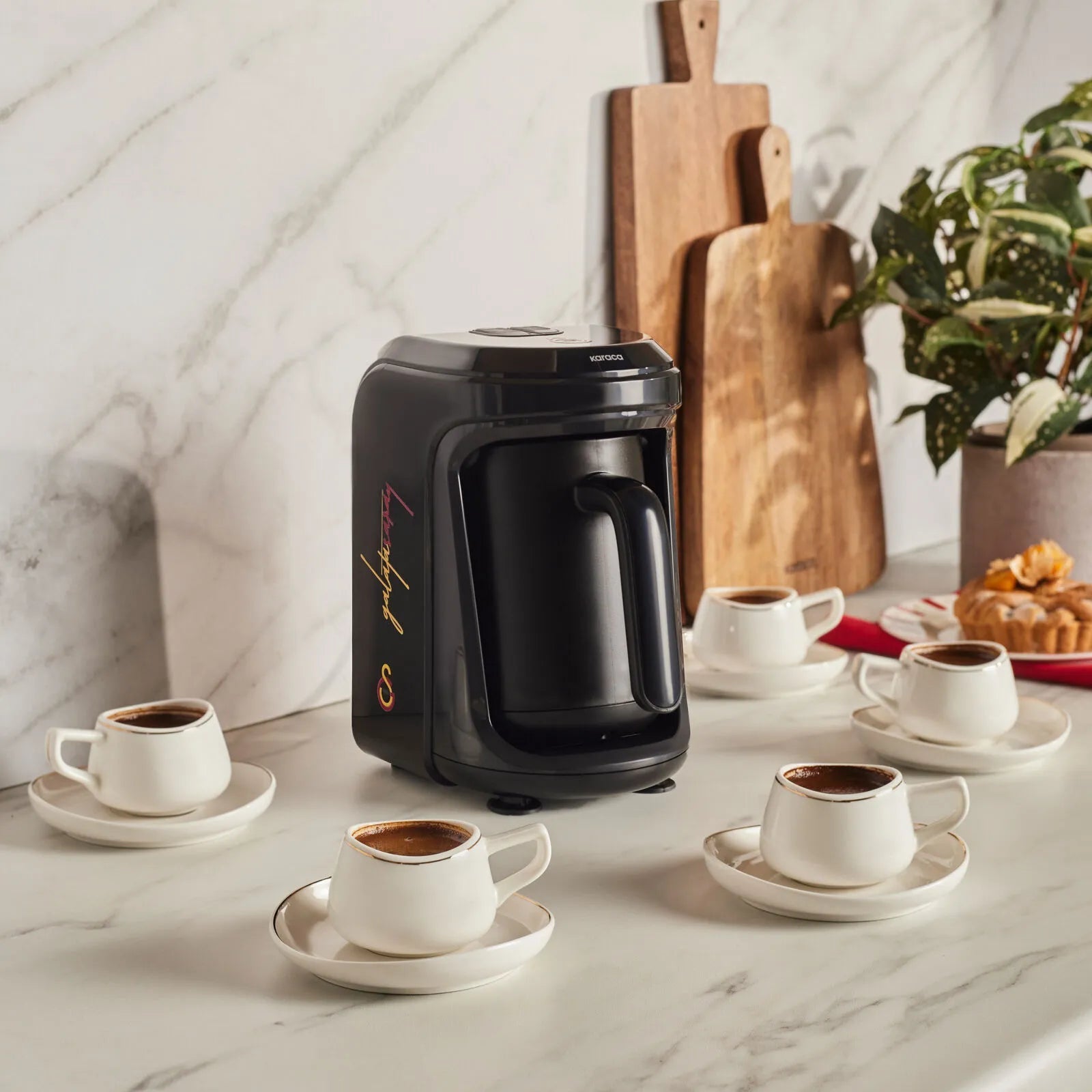 Nyd autentisk tyrkisk kaffe og lækre mælkedrikke med Karaca x Galatasaray Hatır Hüps. Uanset om du ønsker klassisk tyrkisk kaffe, kaffe brygget med glødeeffekt eller en cremet mælkedrik, sørger maskinen for perfekt smag og konsistens hver gang. Med kapacitet til op til 5 kopper er den ideel til både hverdag og gæster.