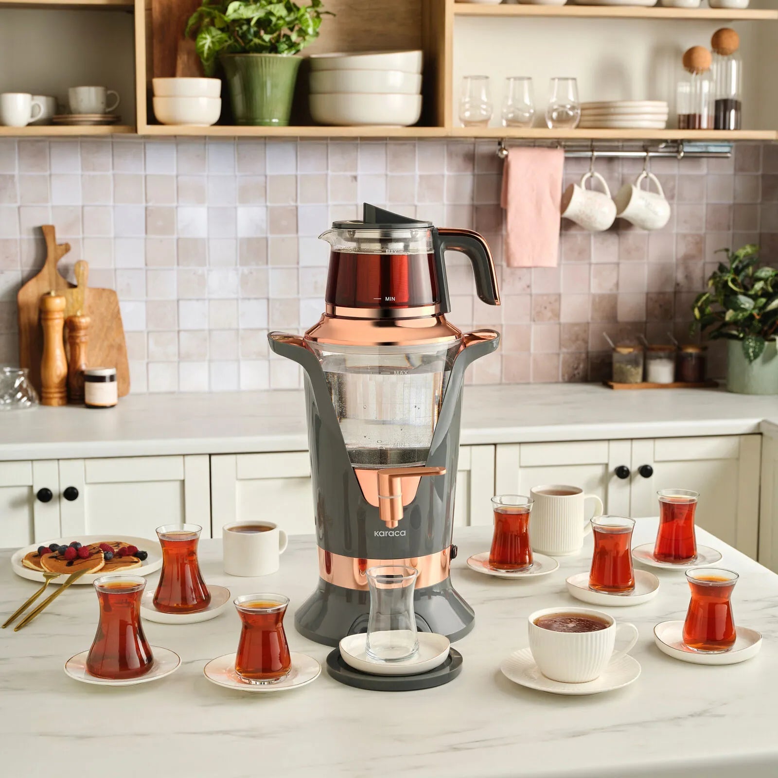 Karaca Maxiva Semaver kombinerer den traditionelle teoplevelse med et moderne og stilrent design. Med en 1 liters glastekande og en 3 liters XL glasvandbeholder kan du brygge op til 35 glas te ad gangen* – perfekt til store familier og gæsteborde.