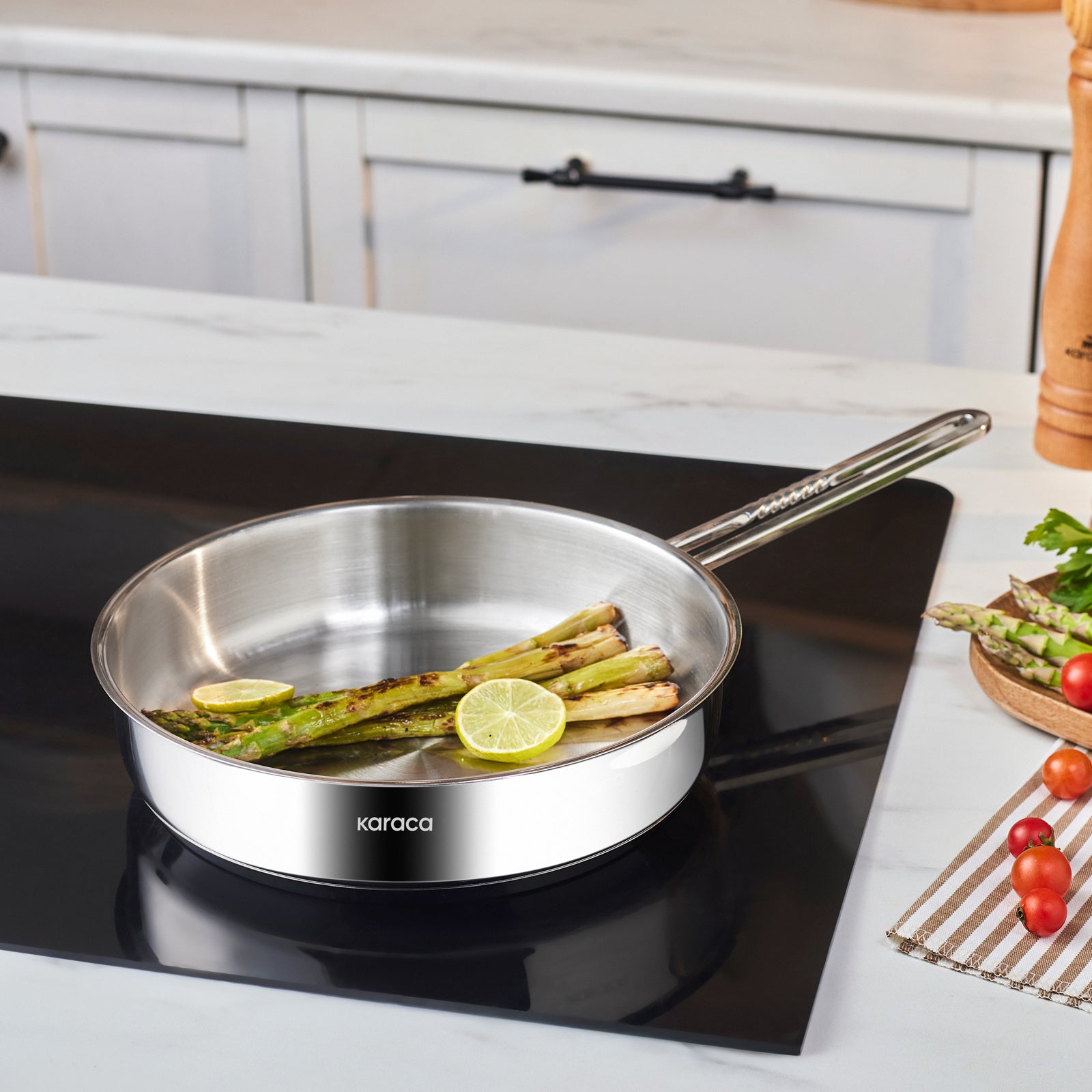 Karaca Sürmene stålpande på 24 cm er et solidt og funktionelt valg til daglig madlavning. Den robuste stålkonstruktion sikrer jævn varmefordeling og lang holdbarhed, hvilket gør den ideel til stegning af kød, grøntsager, æg og meget mere.
