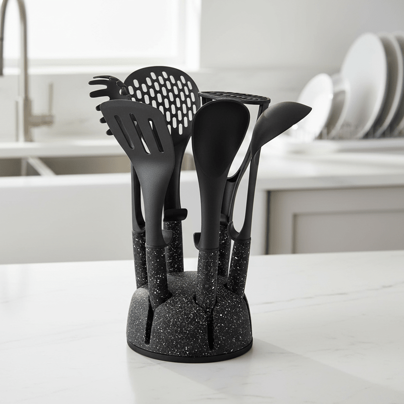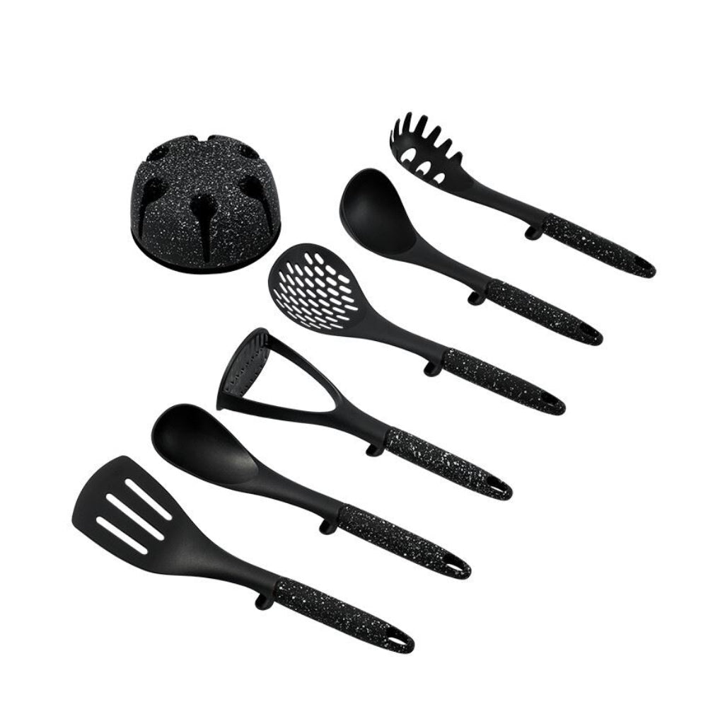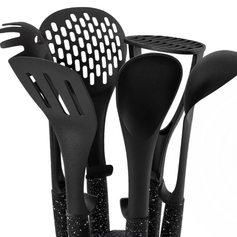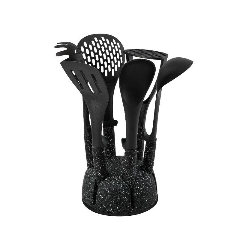 Dette praktiske og stilfulde sæt omfatter syv køkkenredskaber, der hjælper dig i daglig madlavning og servering. Den sorte base med subtile marmoragtige detaljer giver et moderne og eksklusivt udtryk, som matcher mange stilarter og farveskemaer i køkkenet.