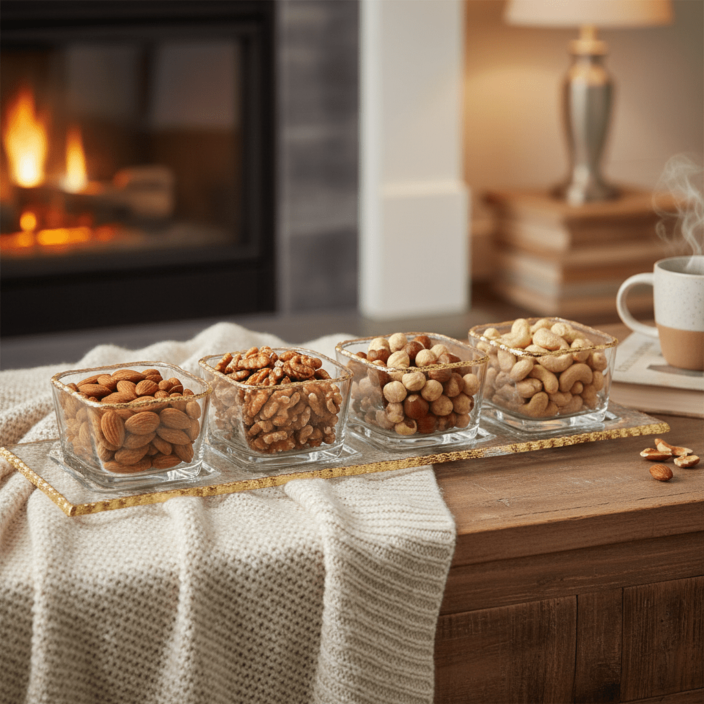 - Indeholder: 4 glasskåle + 1 glasbakke