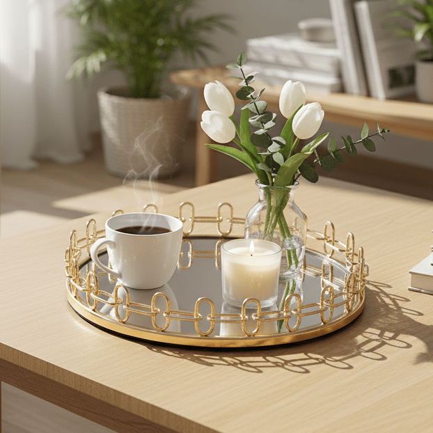 Tablettet er fremstillet i glas og fungerer både som praktisk underlag til servering og som dekorativ base til lys, vaser eller små arrangementer. Det kan bruges i stuen, på spisebordet eller som centerpiece ved festlige lejligheder.