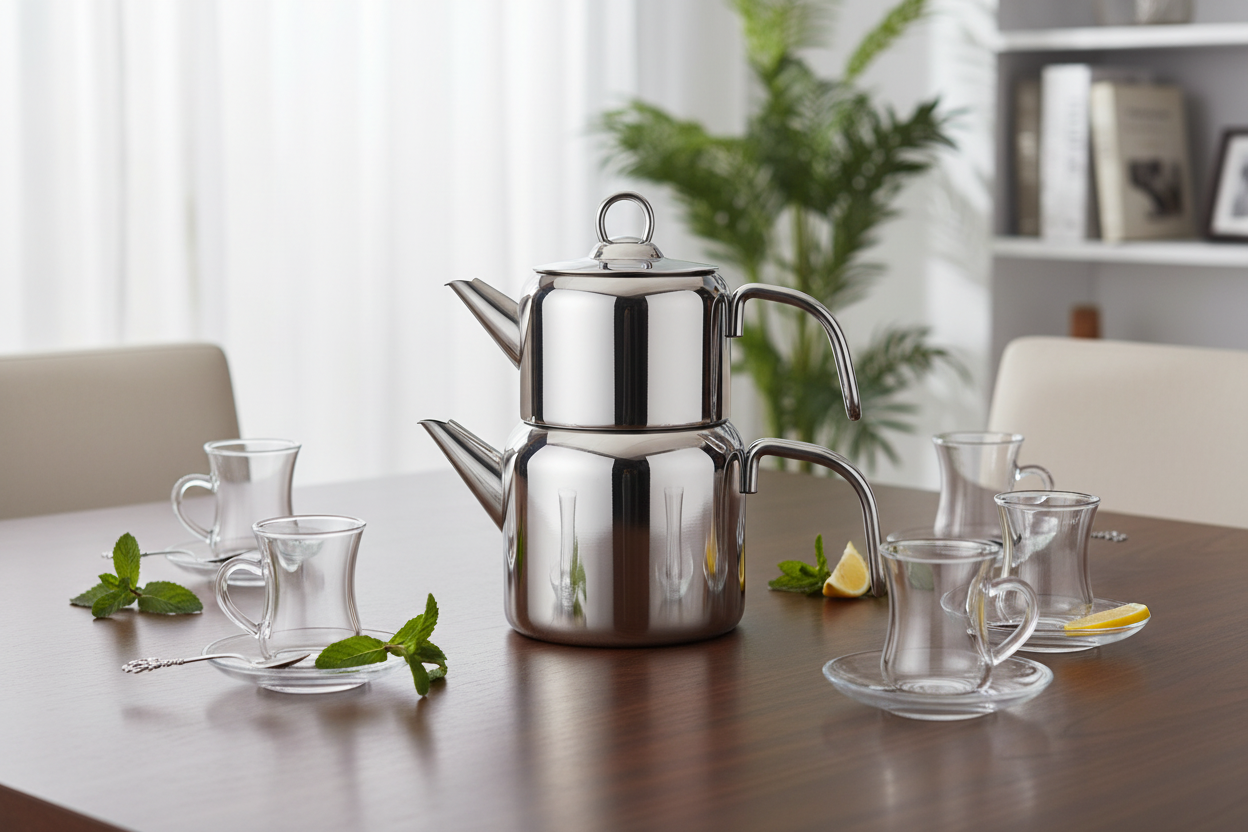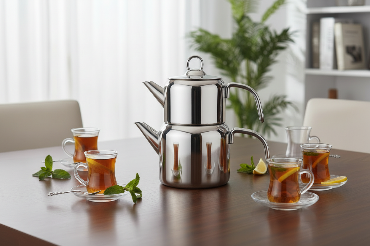 Karaca Mani er et stilfuldt og funktionelt tekandesæt i holdbart rustfrit stål. Sættet består af en 0,70 l tekande og en 1,4 l vandbeholder, som tilsammen giver den perfekte mængde til både hverdagsbrug og gæstebud. Det er kompatibelt med induktionskomfurer, opvaskemaskinesikkert og designet med praktiske metalhåndtag, der tåler varme. Et tidløst valg for teelskere, der ønsker kvalitet og elegance i køkkenet.