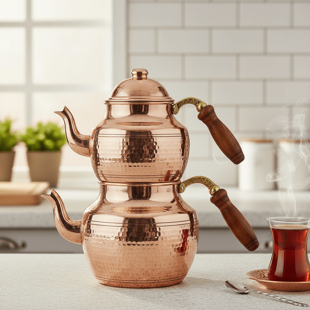Karaca Alacahöyük Midi tekanden er fremstillet i kobber og kombinerer traditionelt håndværk med klassisk tyrkisk te-kultur. Det elegante og autentiske design gør den til et smukt indslag i køkkenet, samtidig med at den er funktionel og ideel til servering af te til familie og gæster.