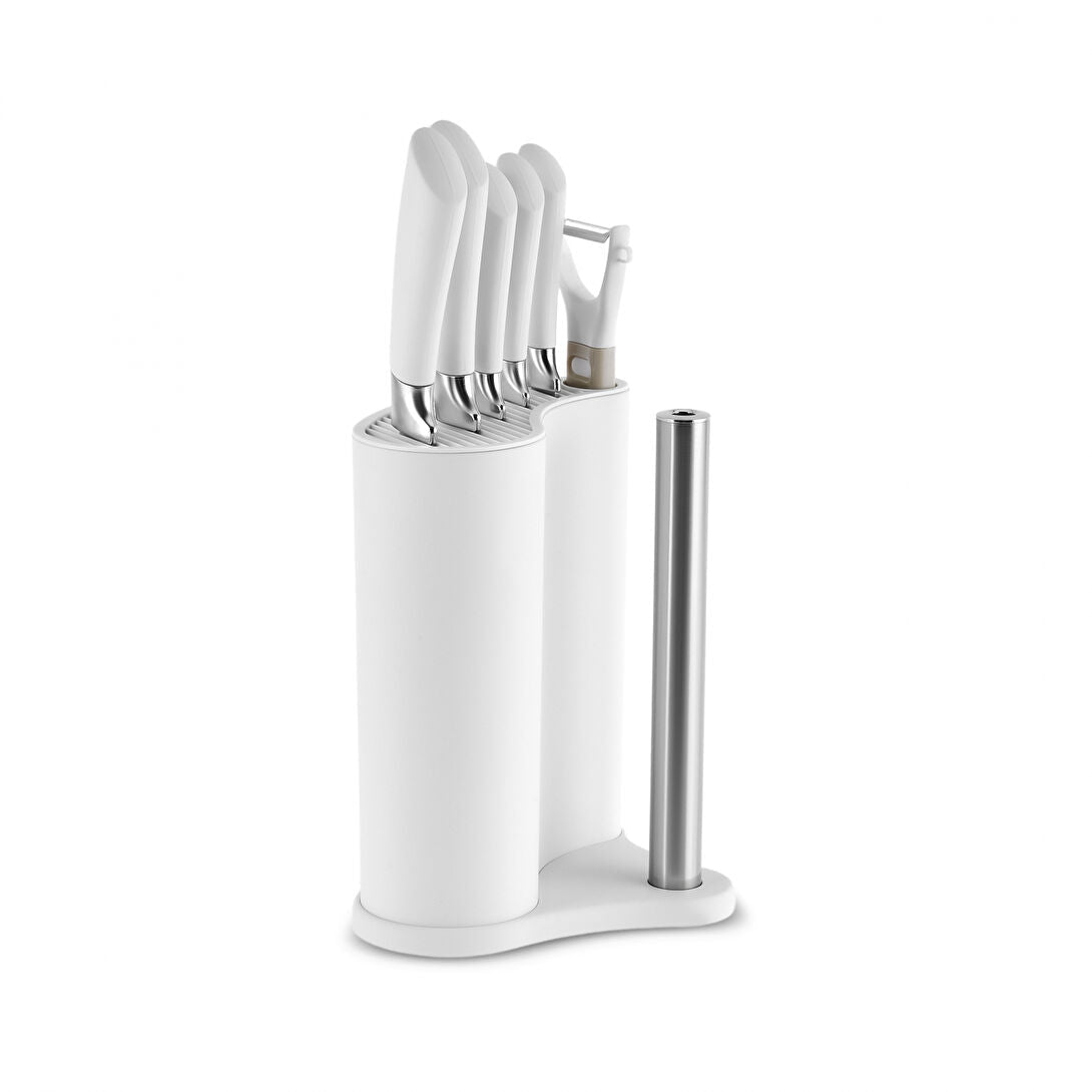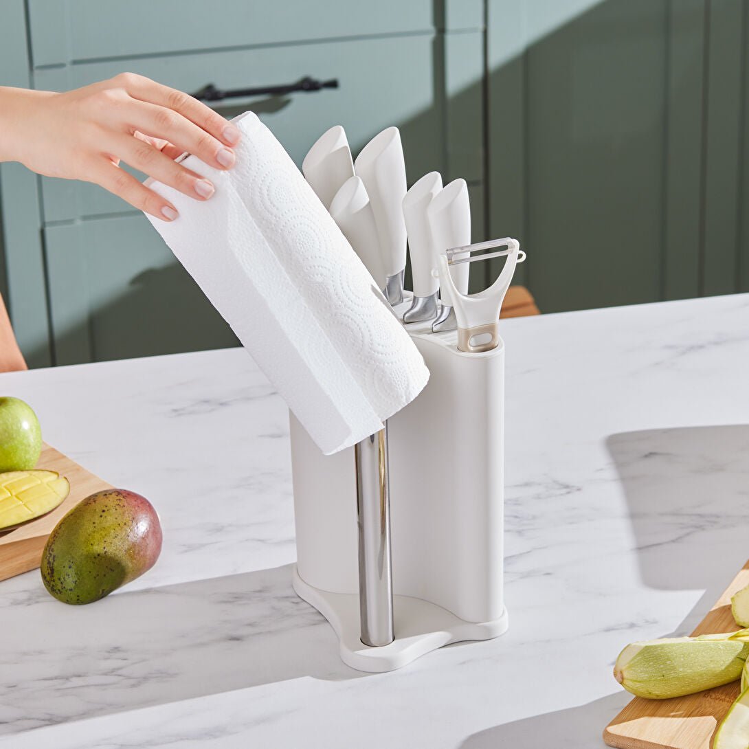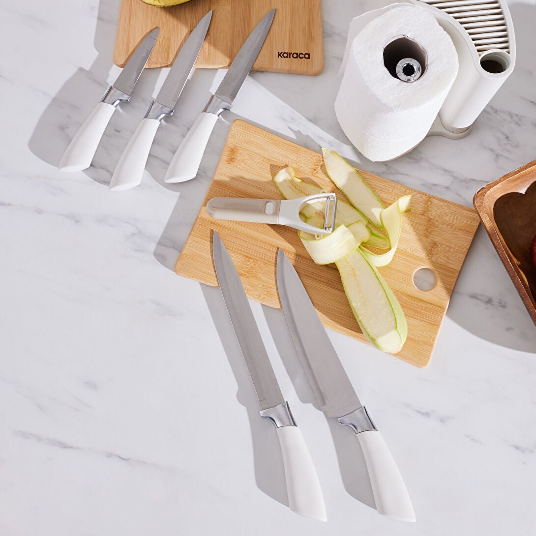Gør køkkenarbejdet nemmere og mere effektivt med Karaca Mega Force 7-delt knivsæt, et alsidigt sæt designet til daglig madlavning. Sættet kombinerer skarpe knive i slidstærk 420 stålkvalitet med en praktisk servietholder, der sikrer både orden og funktionalitet på køkkenbordet.