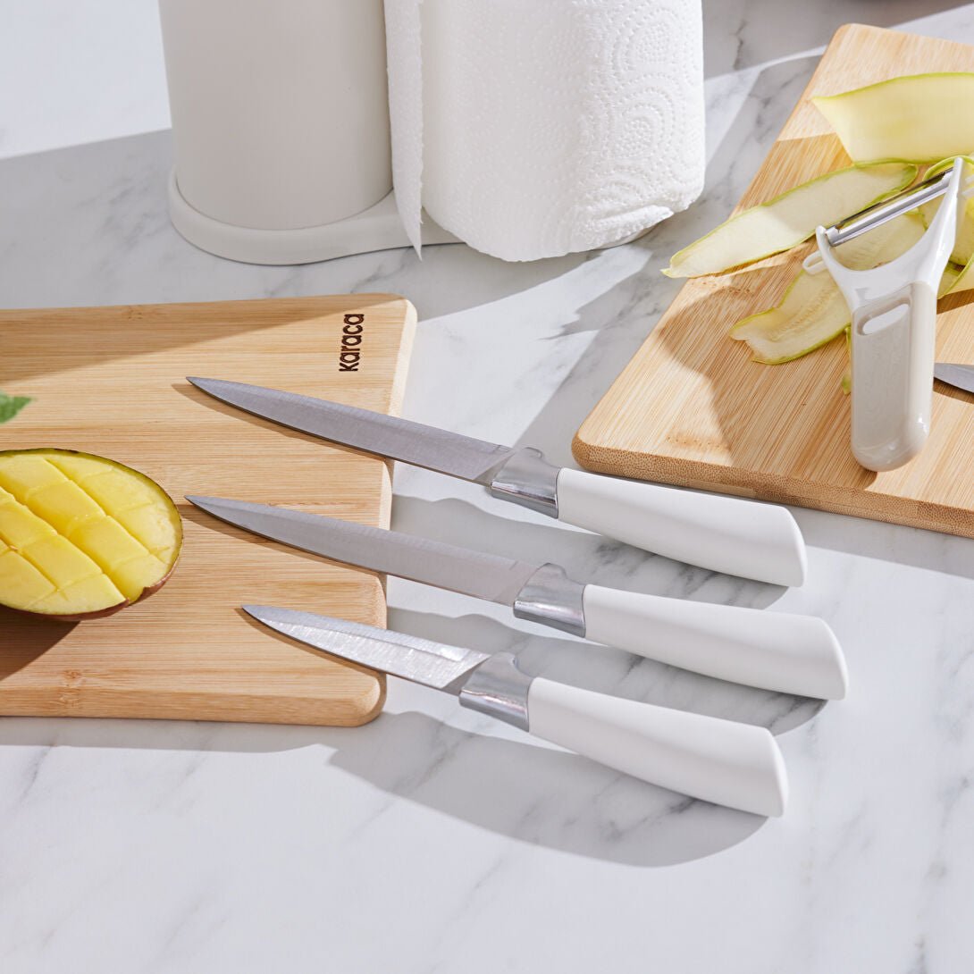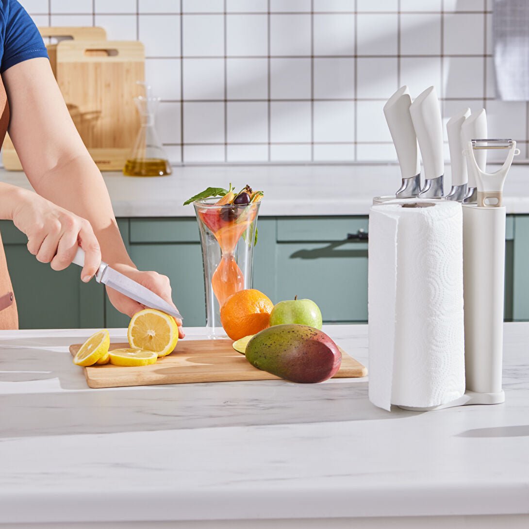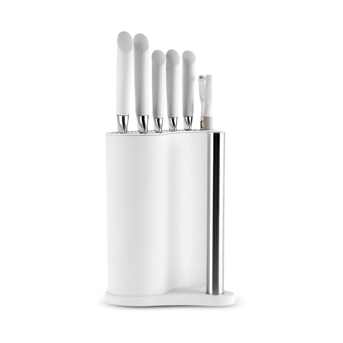 Gør køkkenarbejdet nemmere og mere effektivt med Karaca Mega Force 7-delt knivsæt, et alsidigt sæt designet til daglig madlavning. Sættet kombinerer skarpe knive i slidstærk 420 stålkvalitet med en praktisk servietholder, der sikrer både orden og funktionalitet på køkkenbordet.