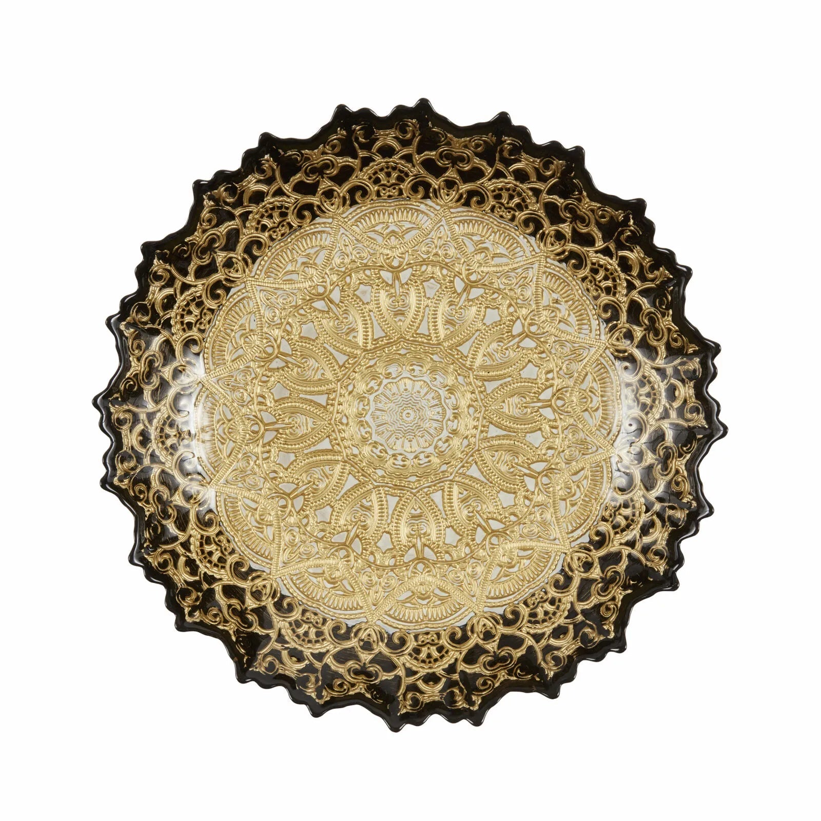 Med sin generøse diameter på 34 cm fungerer Kashida-fadet perfekt som et markant midtpunkt på spisebordet, en stilfuld detalje på en konsol eller som en del af en dekorativ opstilling i vitrineskabet. Det varme guldskær skaber en elegant atmosfære og tilfører rummet karakter og dybde.