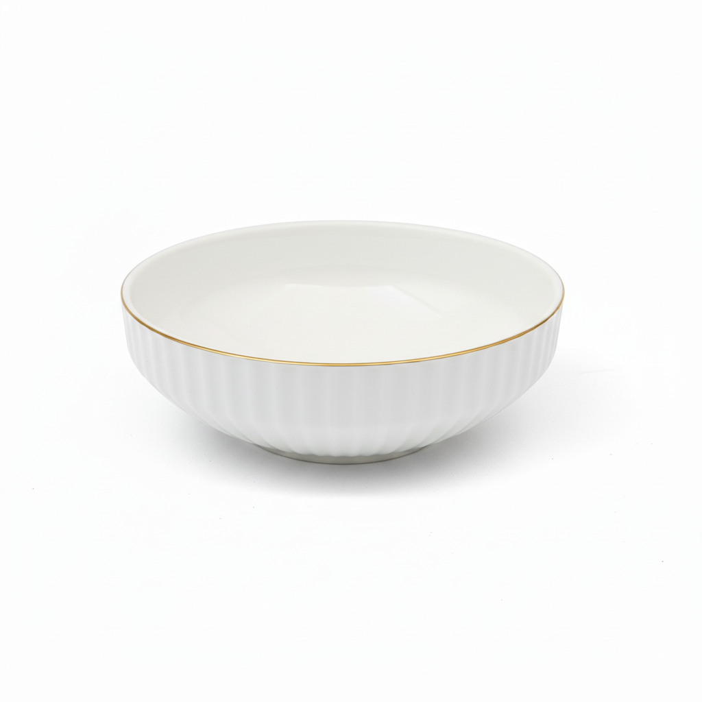 Det smukke Vera-design kombinerer klassisk hvidt porcelæn med en raffineret guldkant, som tilfører borddækningen et luksuriøst og tidløst udtryk. Den rillede struktur på ydersiden giver sættet et elegant og moderne præg, der passer ind i enhver boligstil.
