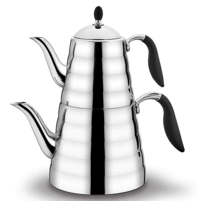Dette stilrene tekandesæt er i to dele ideel til brygning af tyrkisk te. Tekanderne har silikonegreb og er i rustfrit stål.