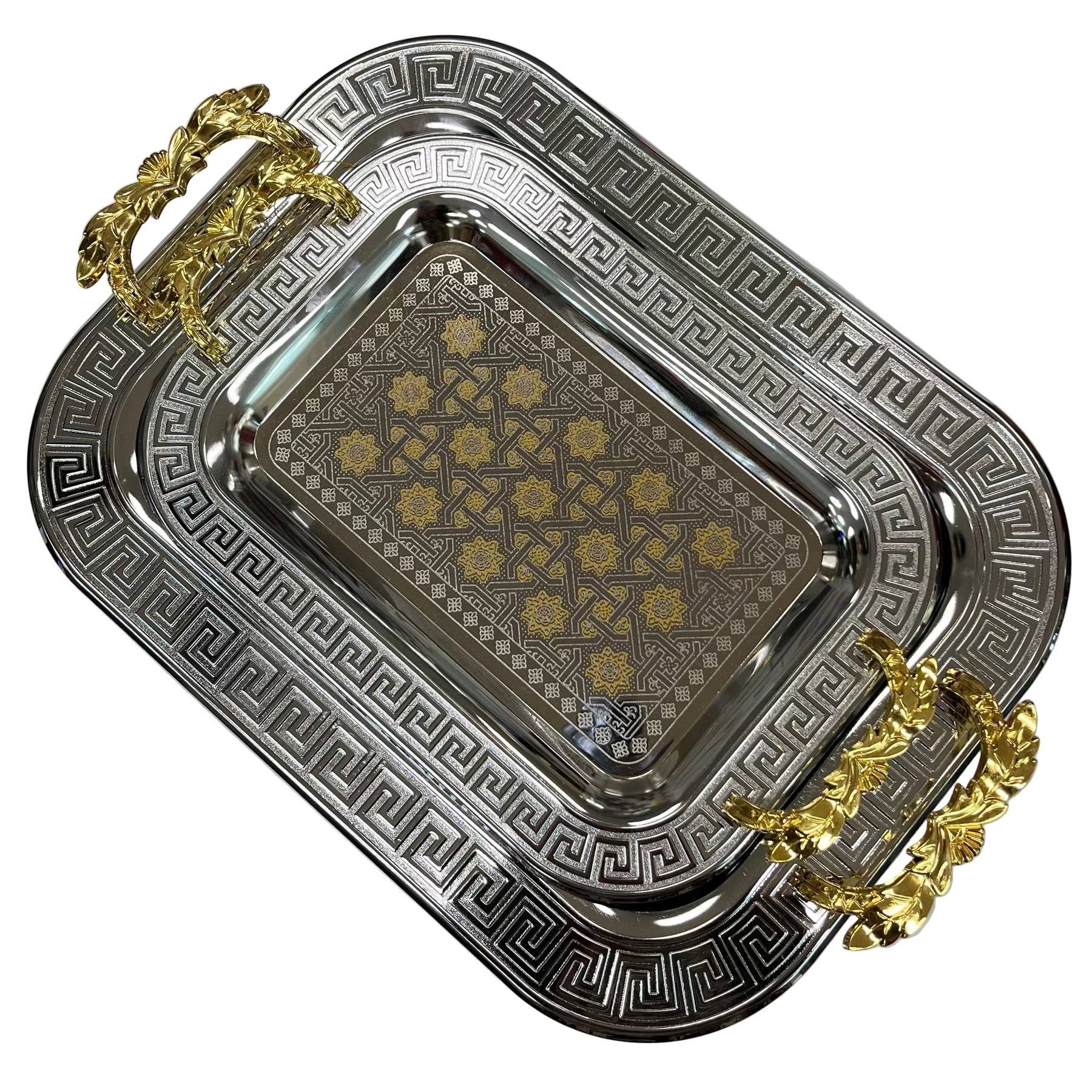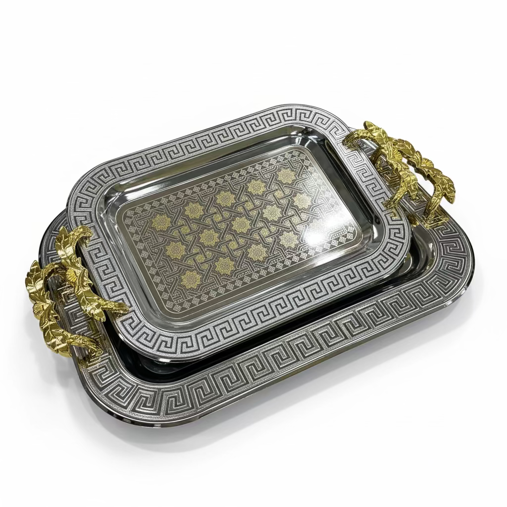 Elegant sæt af mønstrede metalbakker i sølv med gulddetaljer. Bakkerne er både praktiske og dekorative – perfekte til servering af kaffe, snacks eller desserter, både til hverdag og når der kommer gæster.