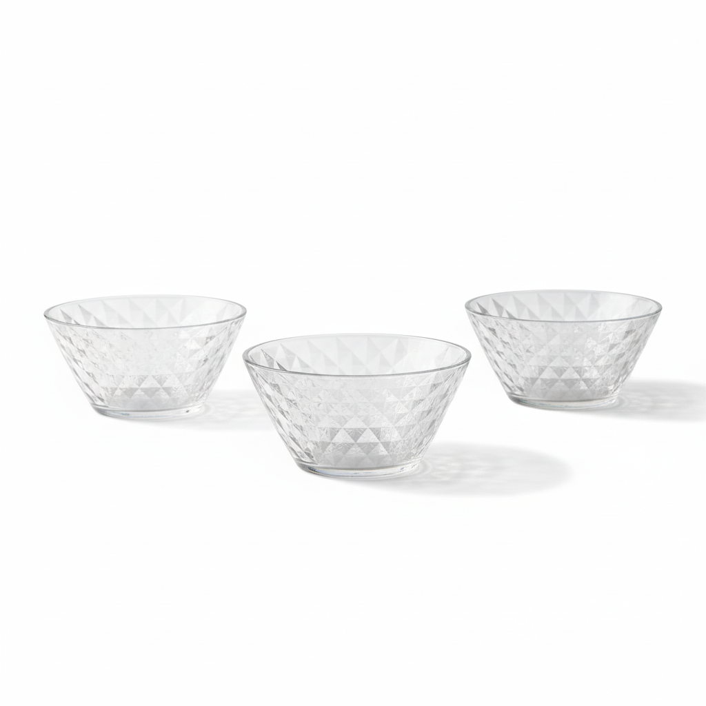 Tilføj et strejf af elegance til dit køkken med dette sæt af 3 klare Artemis glasskåle. Hver skål rummer 330 ml (11 1/4 oz) og har en smuk, mønstret overflade, der kombinerer stil og funktionalitet. Perfekt til servering af snacks, desserter, morgenmad eller småretter.