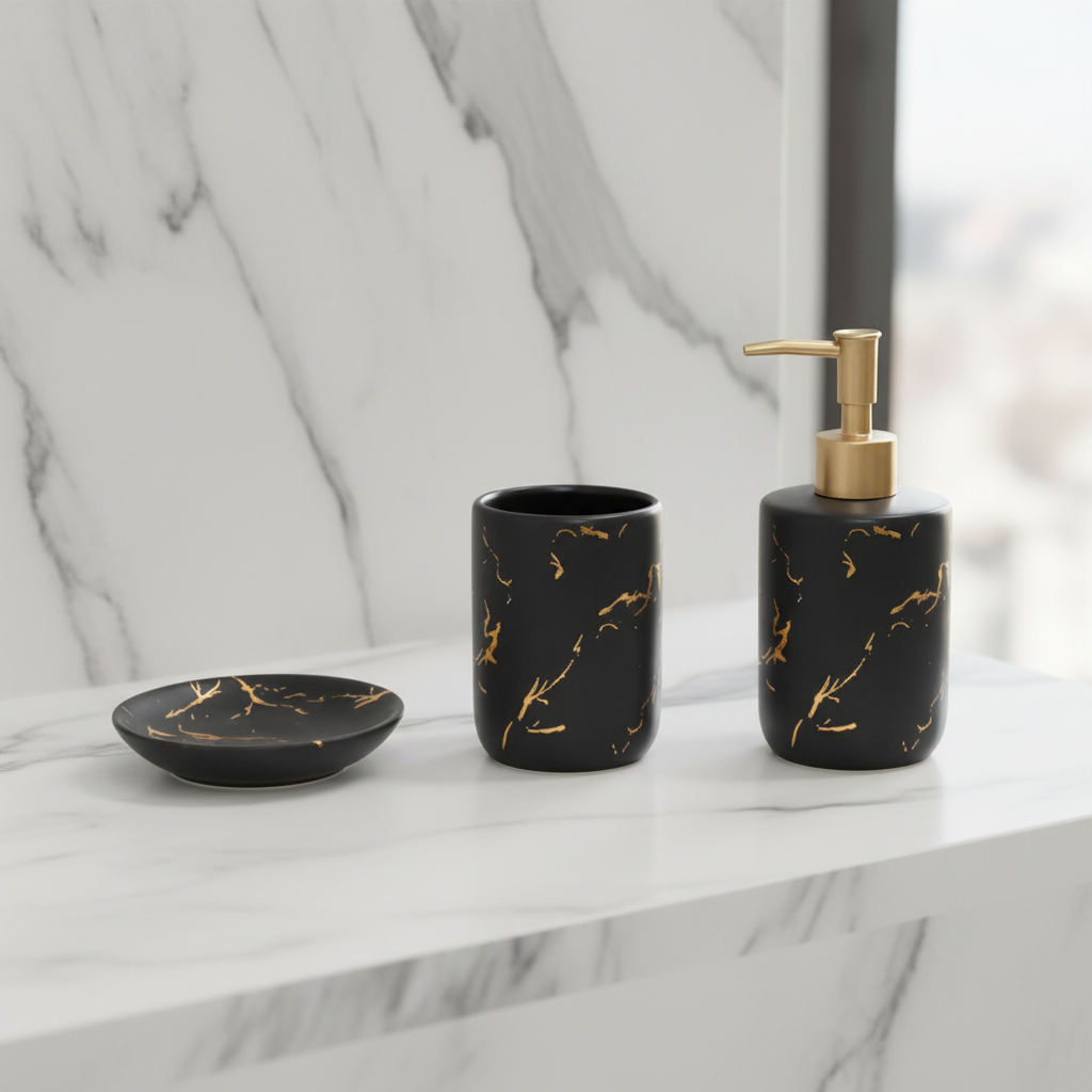 Skab et stilrent og moderne look på badeværelset med Karaca Home Marco badeværelsessæt. Dette 3-delte sæt i sort keramik kombinerer funktionalitet med et minimalistisk design og passer perfekt ind i både moderne og klassiske badeværelsesindretninger.
