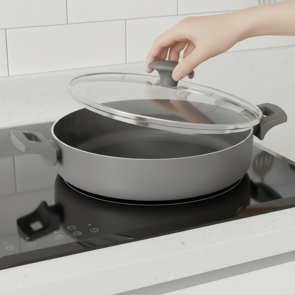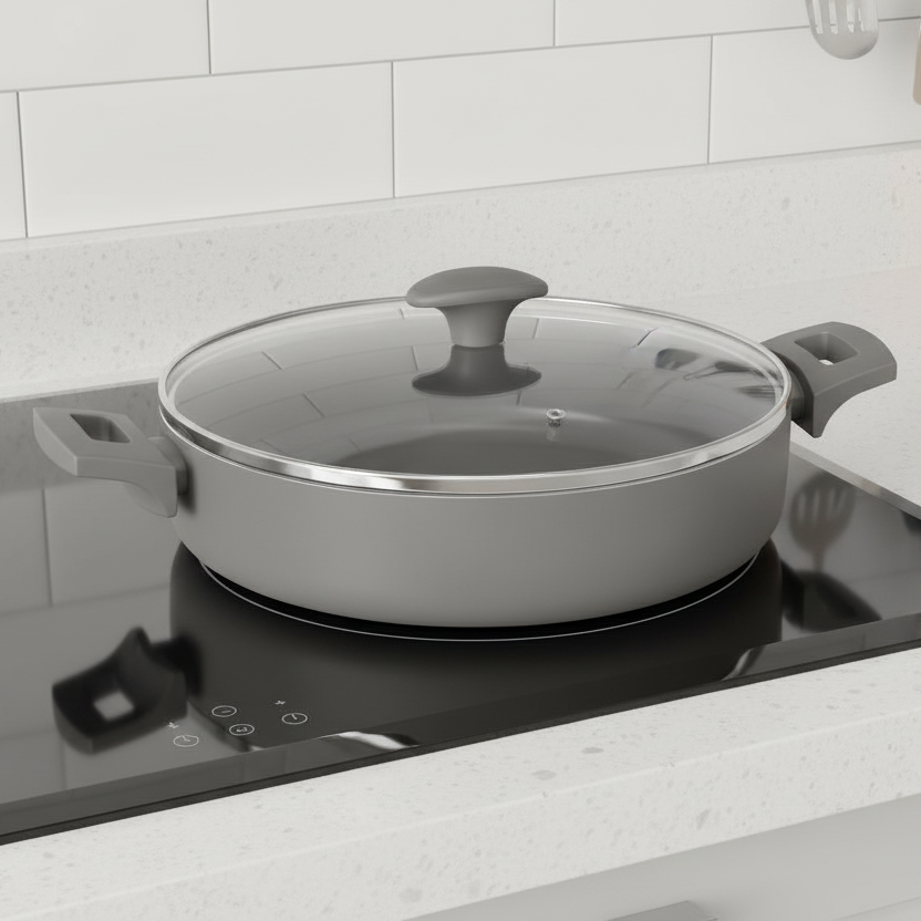 Michelino Alythia serveringspande 28 cm kombinerer elegant design med høj funktionalitet. Den keramiske non-stick-belægning uden PFAS/PTFE gør det muligt at tilberede mad med minimal brug af fedtstof, samtidig med at rengøringen bliver enkel. Panden er ideel til både madlavning og servering direkte ved bordet.