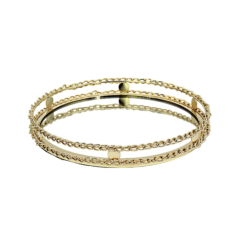 Dette elegante dekorative glasfad i guld (Ø 30 cm) kombinerer luksus og moderne design. Den spejlblanke glasbund reflekterer lyset smukt, mens den dekorative kæderamme i guld giver et sofistikeret og eksklusivt udtryk. Perfekt som serveringsfad, dekorationsbakke eller centerpiece til festlige lejligheder.