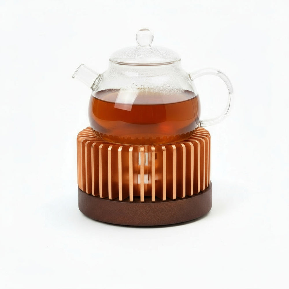Tepottevarmer til Fyrfadslys - Rillet - Kobber/Mørk Træ - 11x6 cm