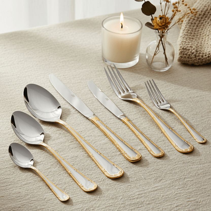 Hvert stykke er fremstillet med fokus på kvalitet og holdbarhed, og det gyldne finish tilføjer et luksuriøst touch til dit spisebord. Sættet inkluderer alt, hvad du behøver af knive, gafler og skeer, nøje designet for både komfort og stil.