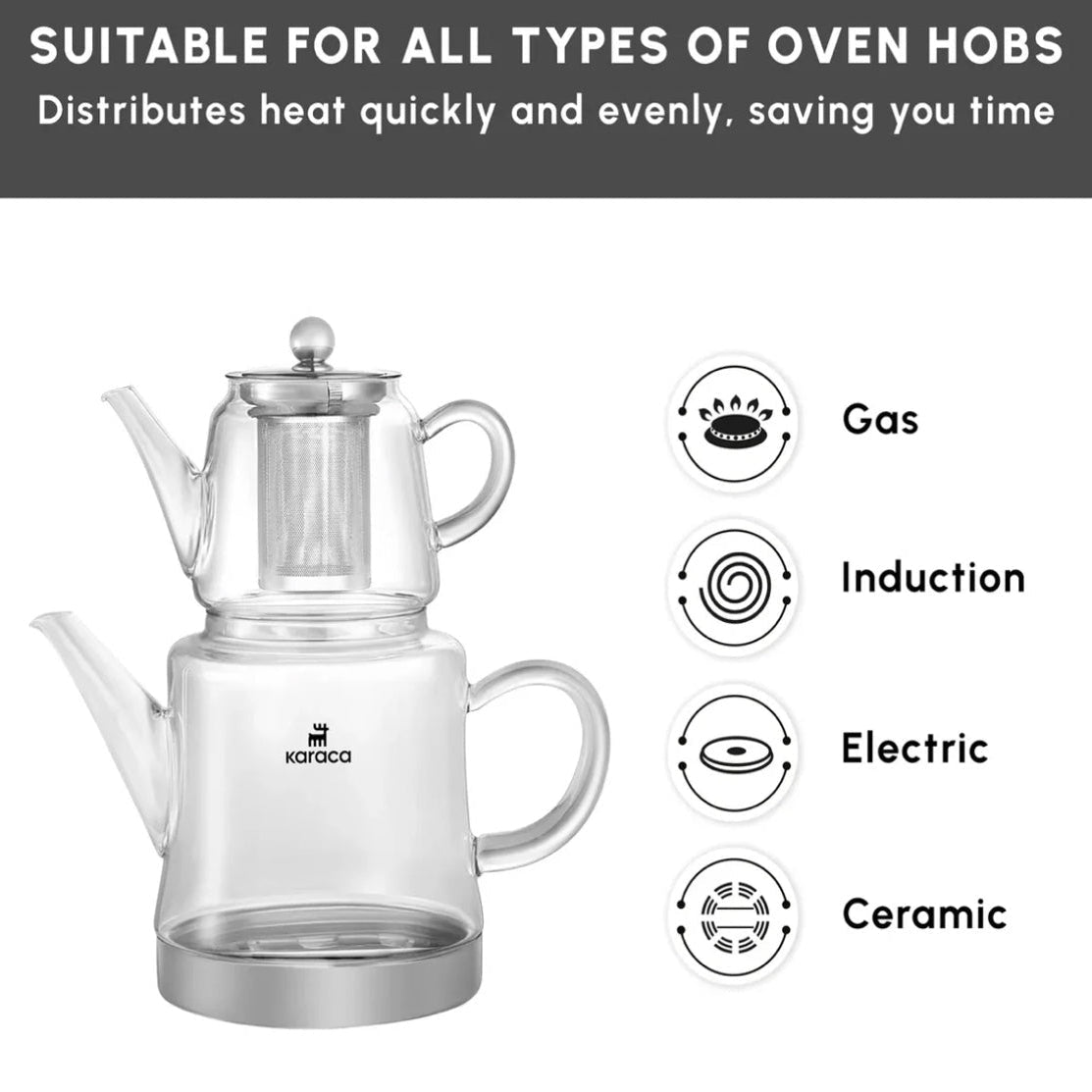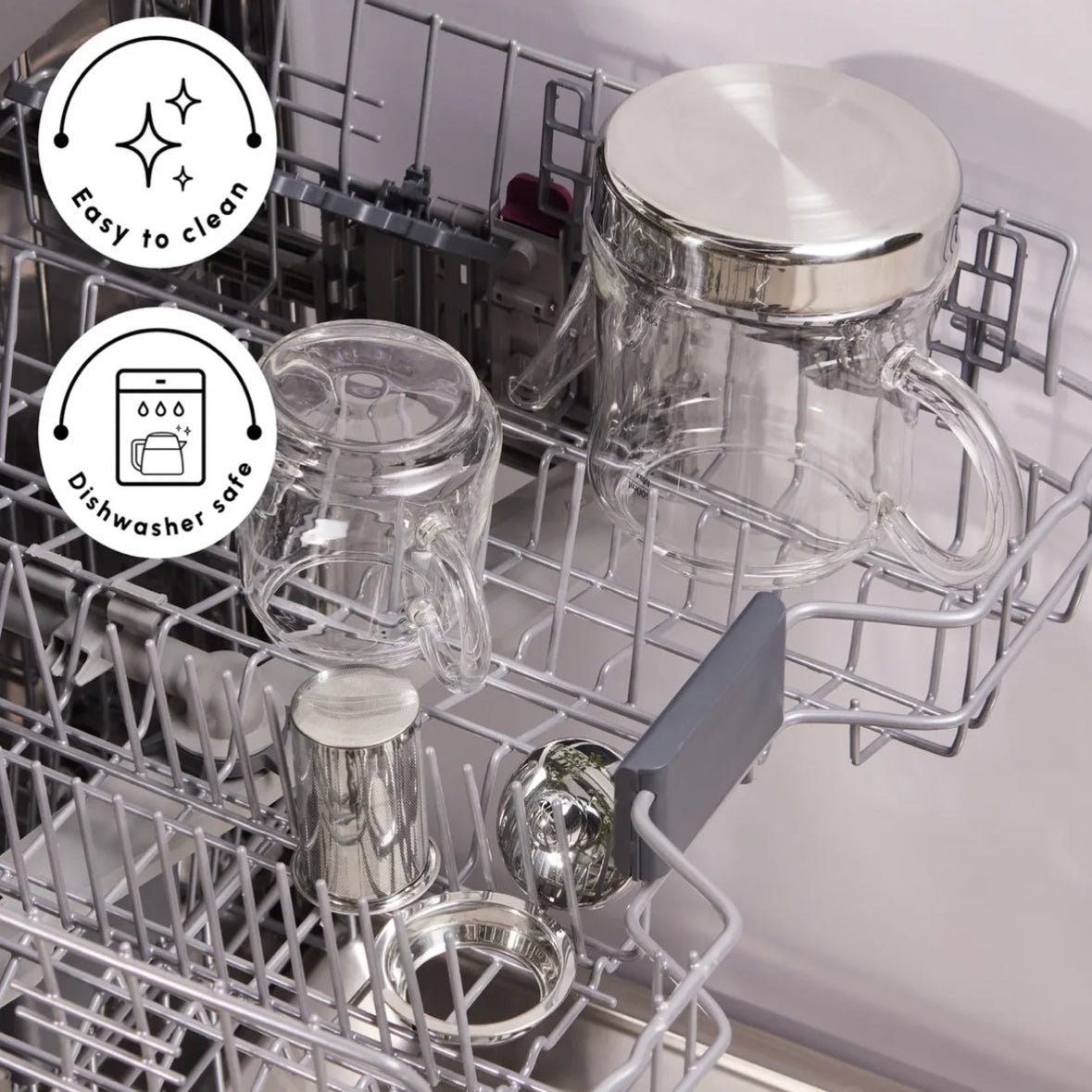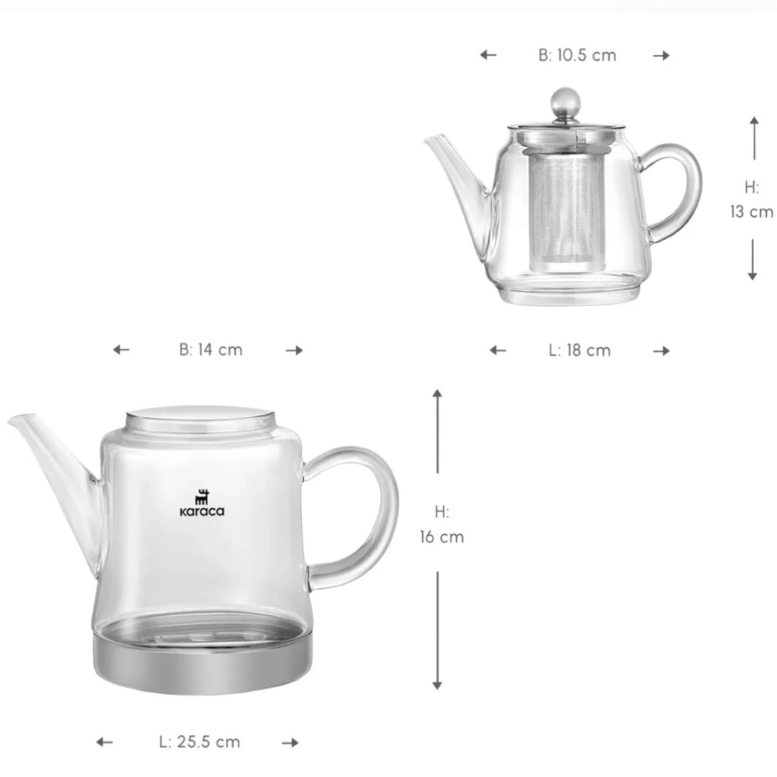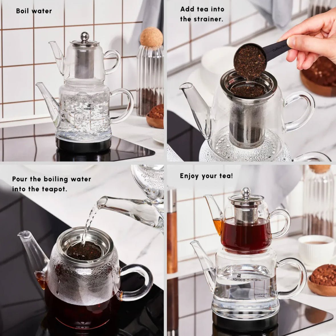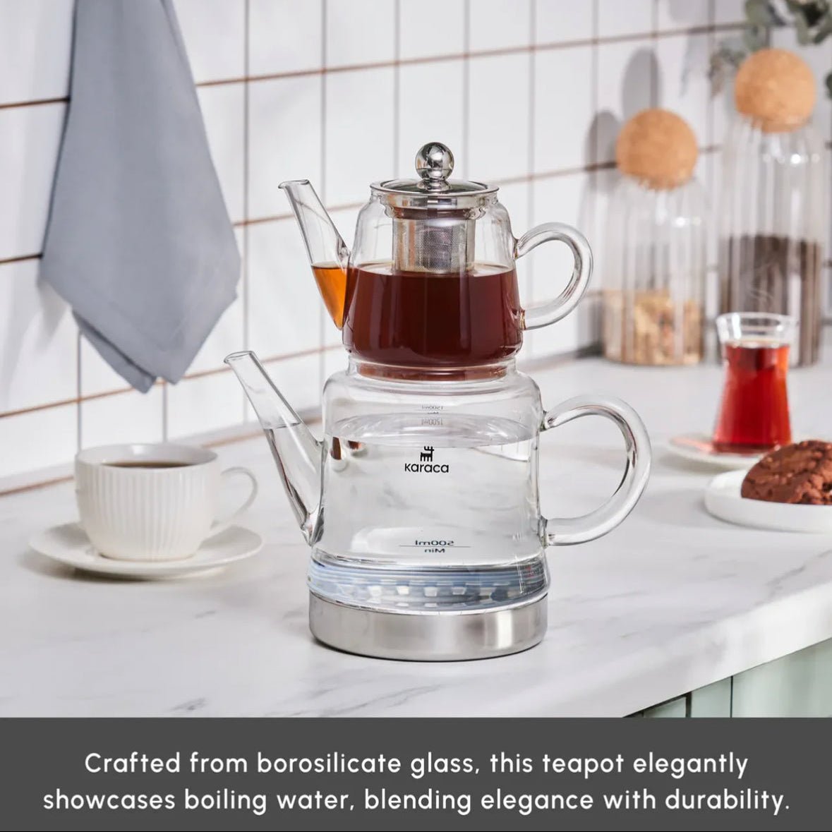 Den øverste tekande rummer 0,45 liter og er fremstillet af specielt varmebestandigt borosilikatglas, som tåler høje temperaturer og temperaturskift. Den nederste vandkande har en kapacitet på 1,8 liter, hvilket gør sættet velegnet til servering af 10–15 teglas ad gangen.