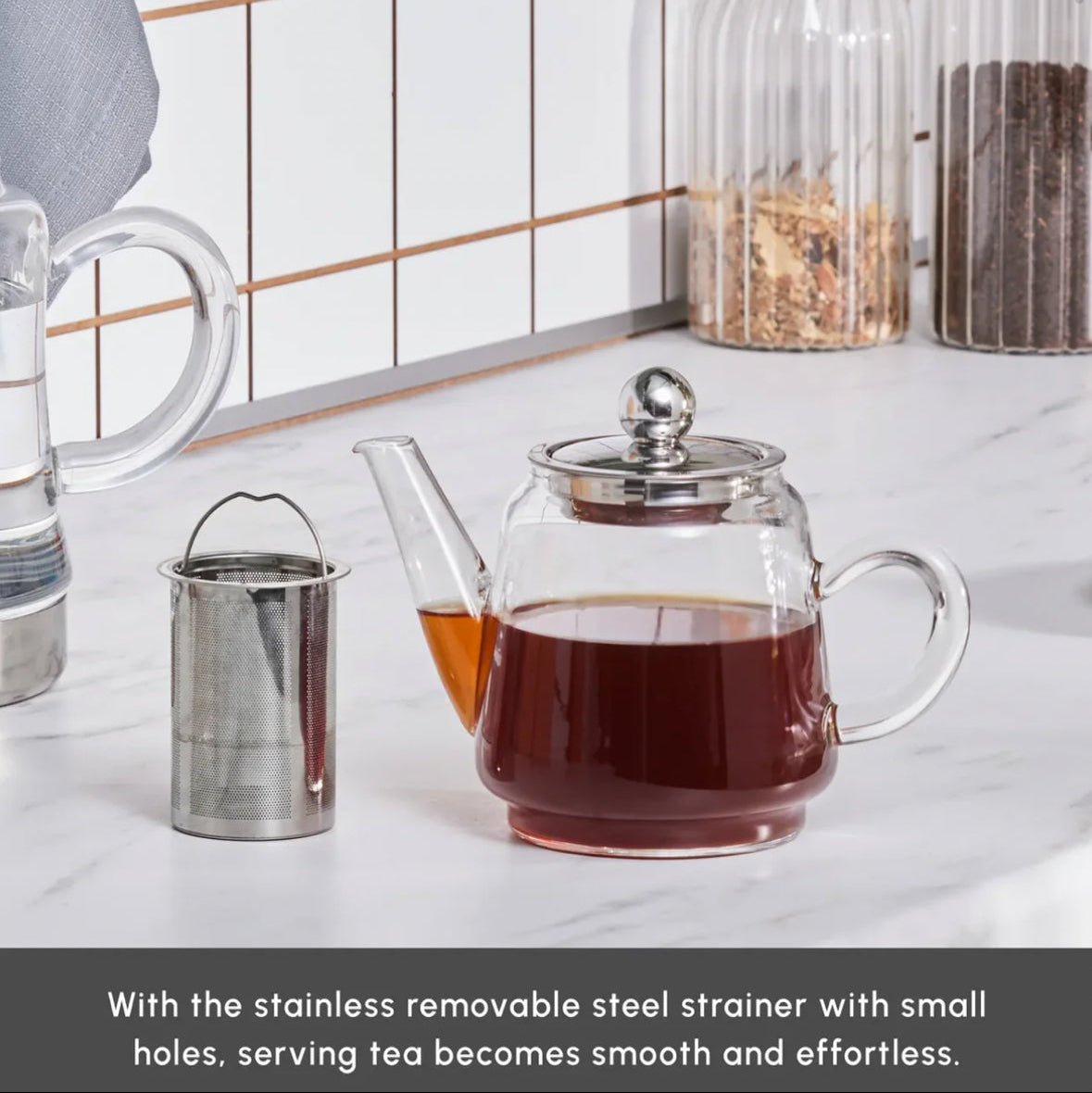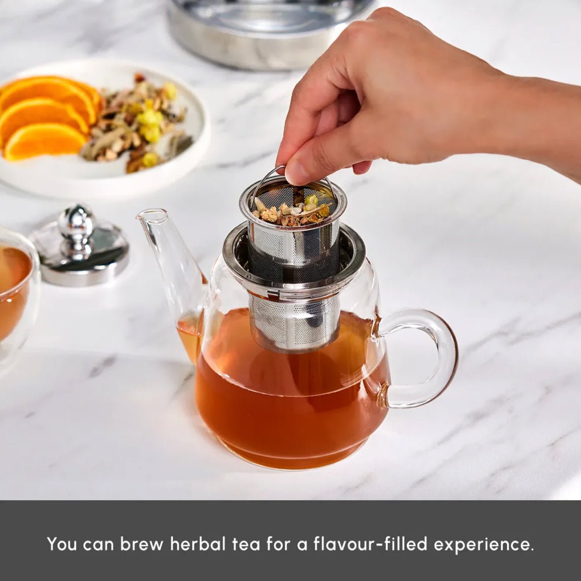 Den medfølgende si i rustfrit stål kan bruges alene på komfuret til brygning af urtete, hvilket giver fleksibilitet og funktionalitet i ét design.